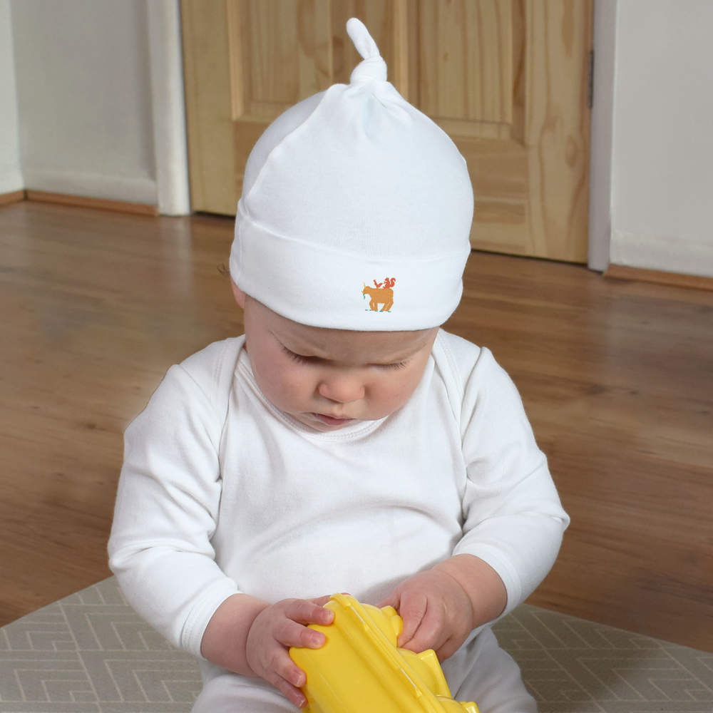 Keep little ones cosy and stylish with this super soft beanie hat. Our baby beanie hats have a knotted top and are printed on the turnover with a unique design. Made from 100% cotton, it can be machine washed and still retain its shape. This beanie hat has a stretch fit so one size fits all, with an approximate circumference of 32cm, it's ideal for babies up to 12 months old.