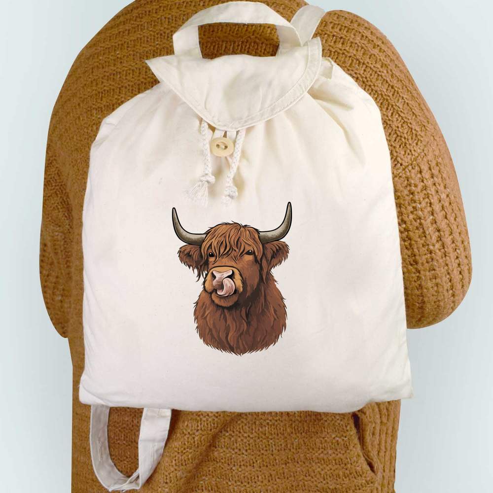 'This charming design features a Highland cow playfully licking its nose, celebrating the distinctive and rugged beauty of the Scottish breed.'