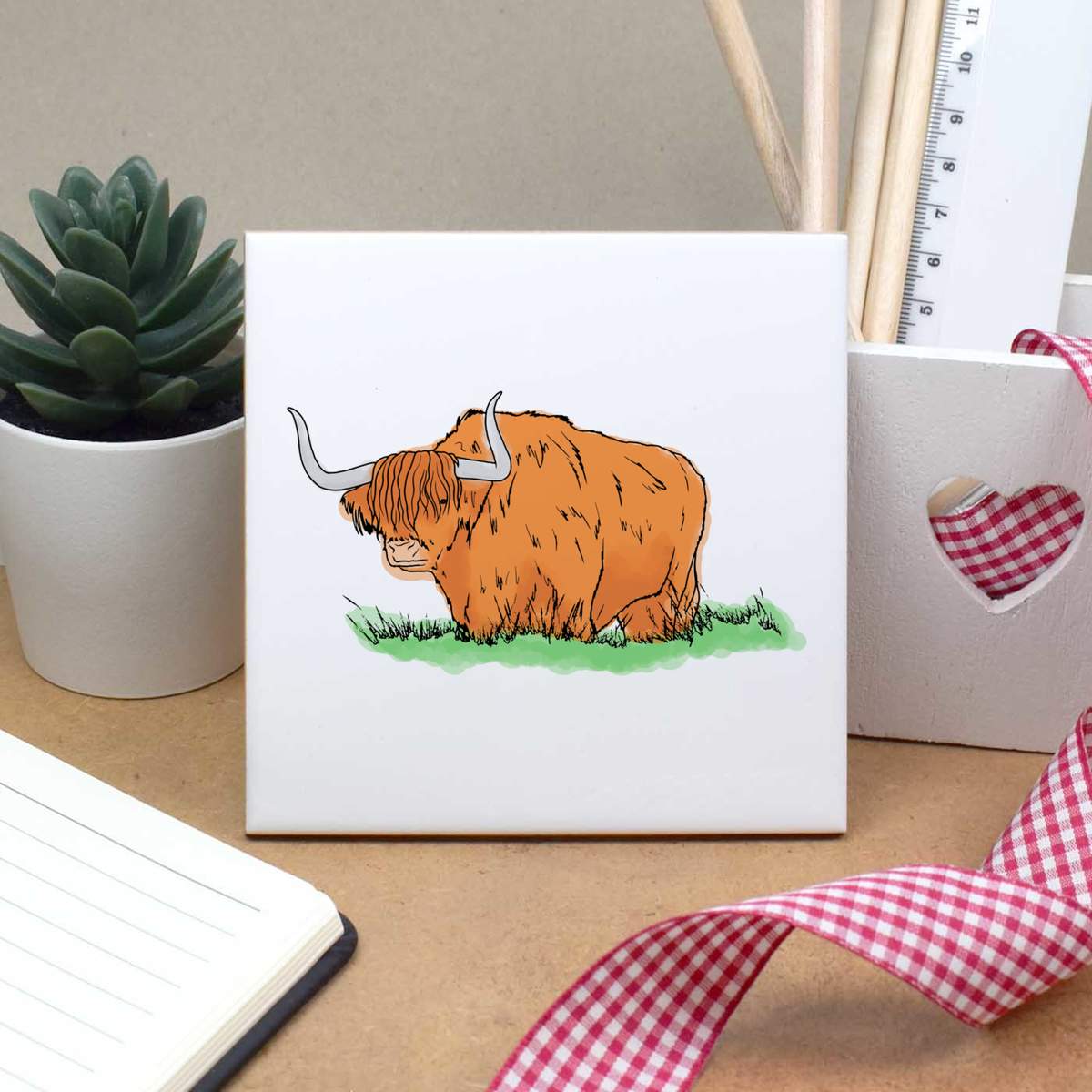 'Highland Cow In Long Grass coloured with watercolour style.'