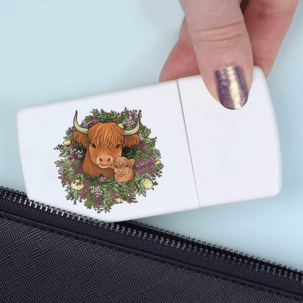 'A highland cow mother and baby surrounded by a gorgeous floral wreath.'
