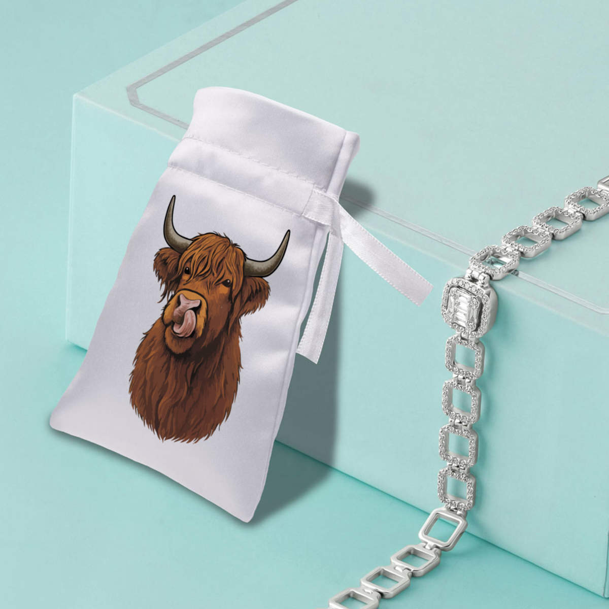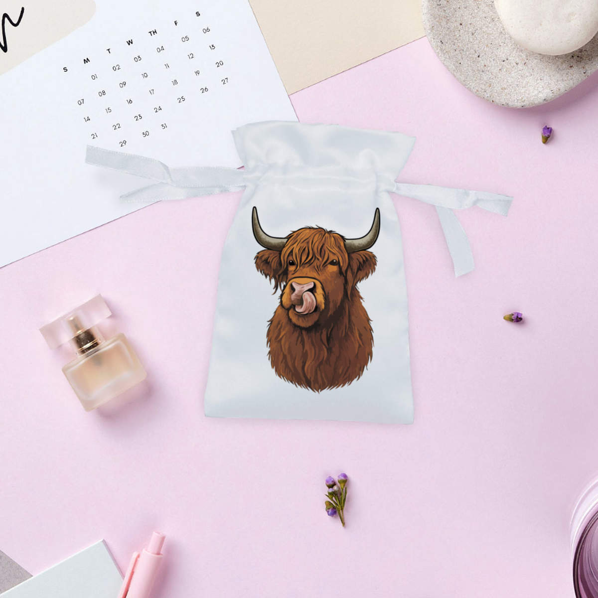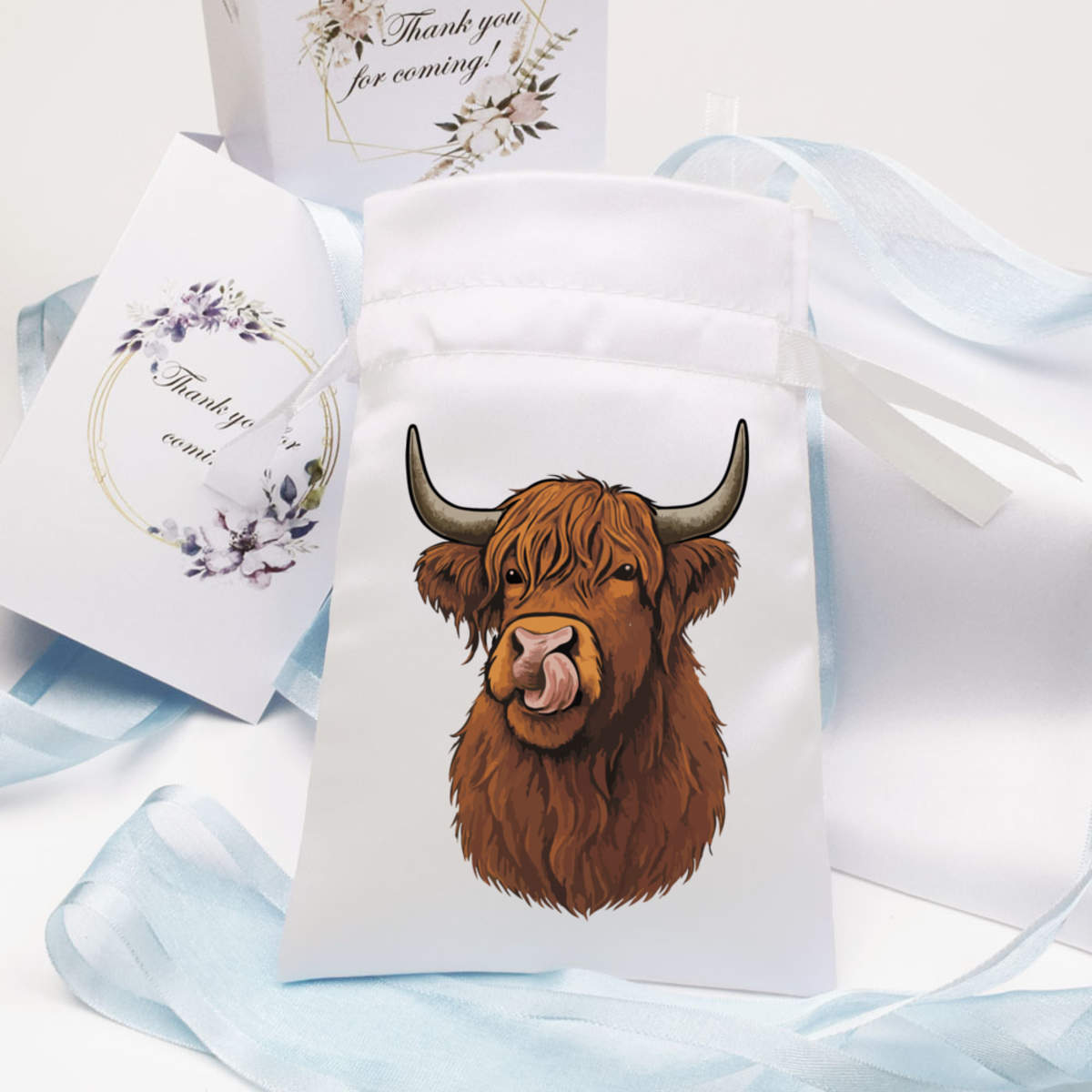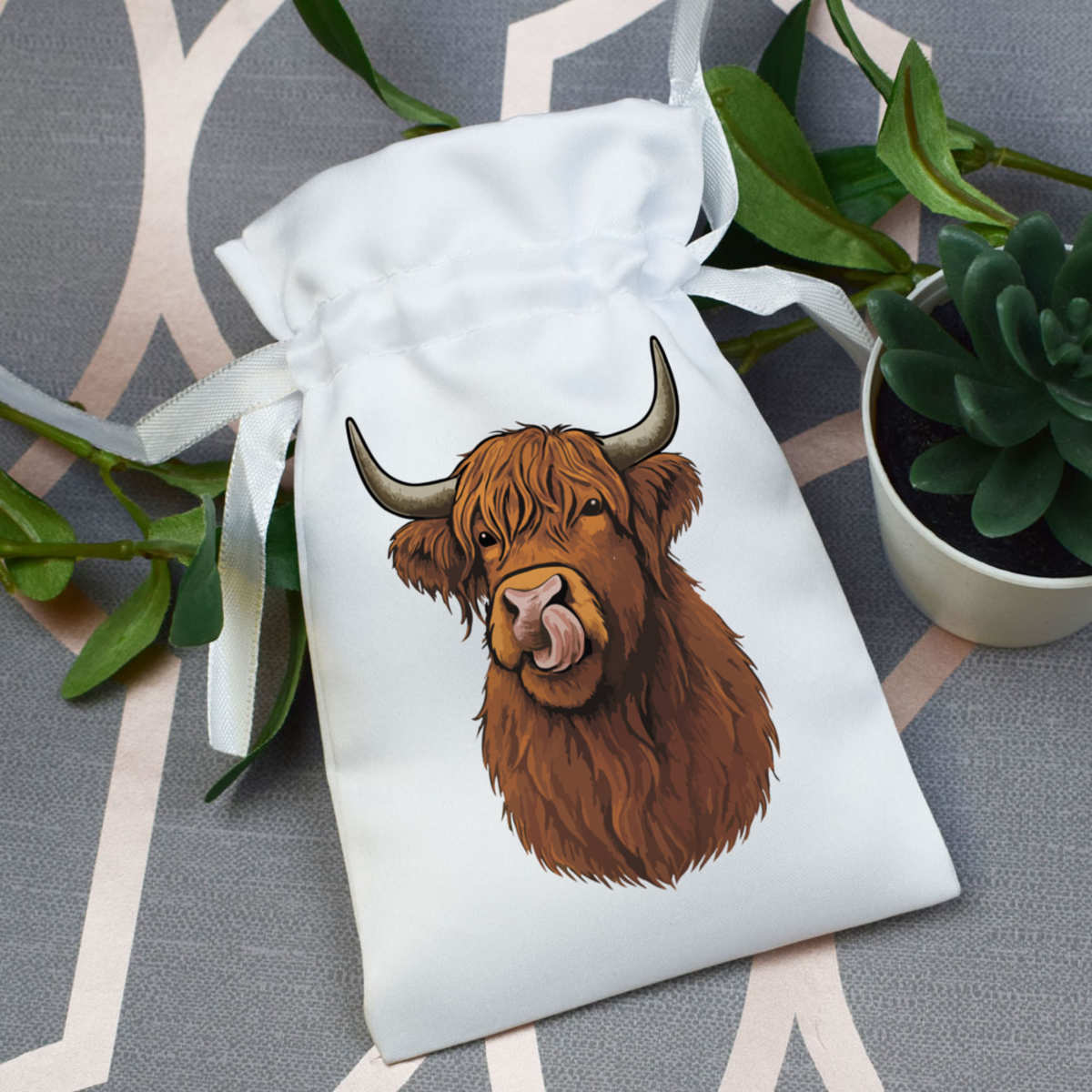 'This charming design features a Highland cow playfully licking its nose, celebrating the distinctive and rugged beauty of the Scottish breed.'