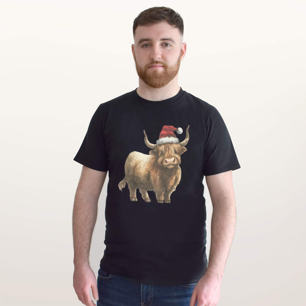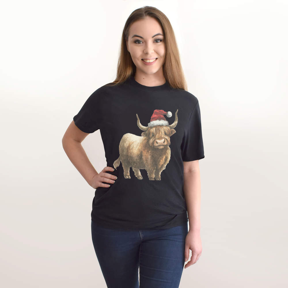 'Highland Cow Wearing Santa Hat' Unisex T-Shirt - 100% Cotton (S-XXL) (TA057535)