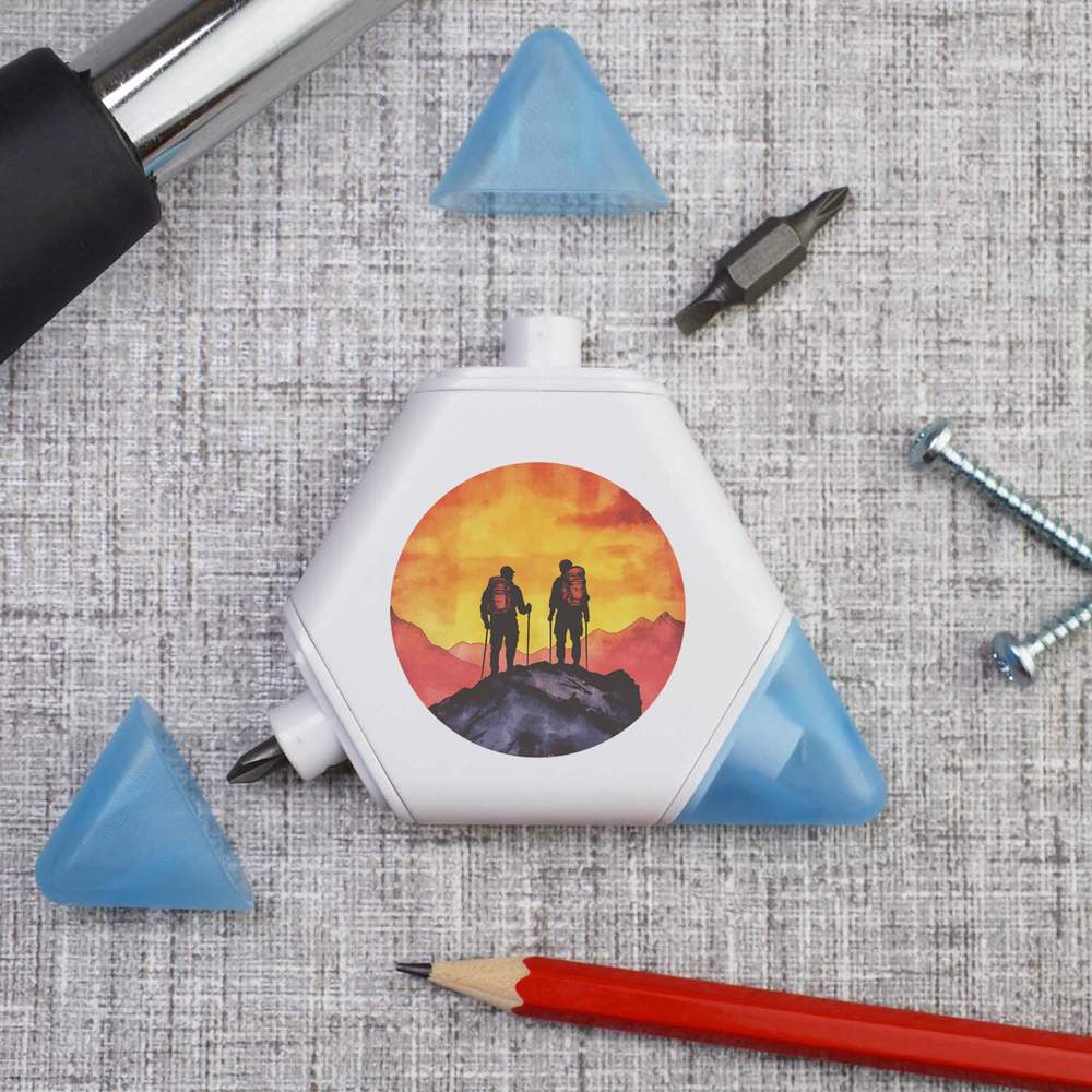 Our triangular compact multi tool is printed on one side with a unique design, making it a great gift for DIY lovers. This 3-in-1 tool set contains a tape measure and 2 different screwdriver attachments and each corner has a snap shut lid. One corner reveals a 1 meter tape measure, while the others hide two reversible screwdriver attachments, one larger and one smaller, both of which have a cross head on one end and a flat head on the other.