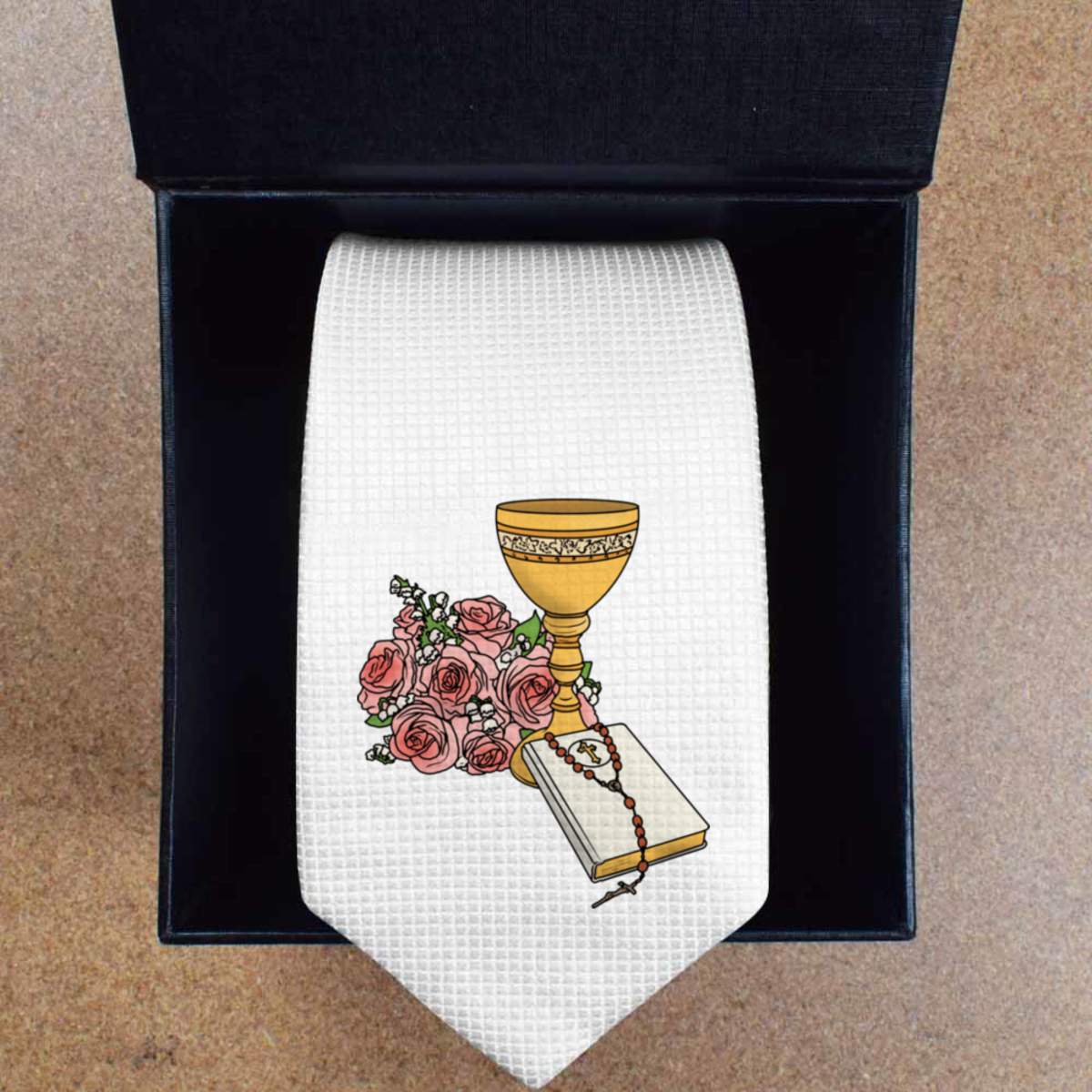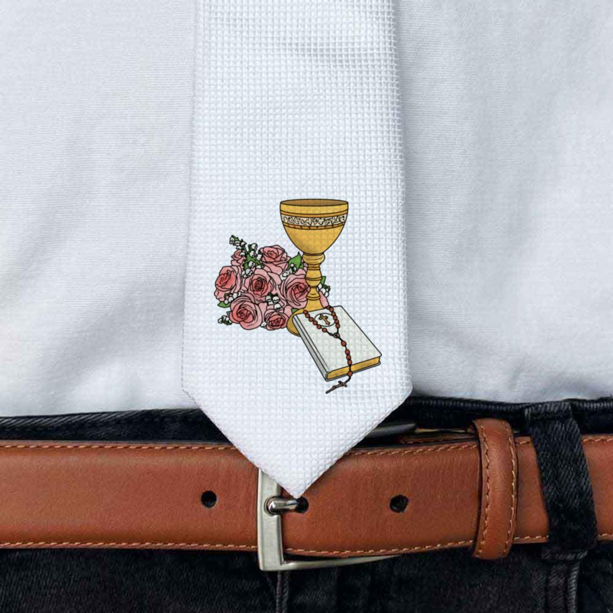 This stylish slim white tie is guaranteed to add class to any outfit. Printed on the front with a design from one of our talented designers, these ties are perfect for formal events, special occasions or making a statement at the office.