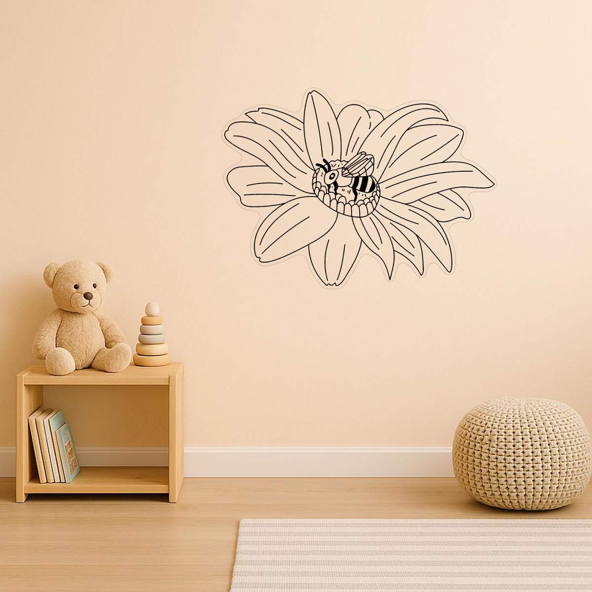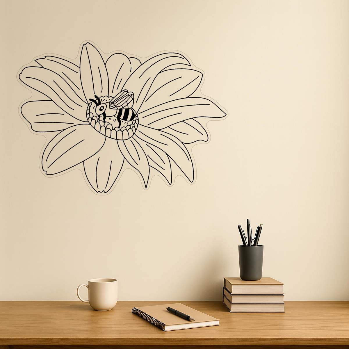 'A gentle honeybee hovers near a daisy flower, reminding us of natures delicate balance. Clean lines with a natural charm.'