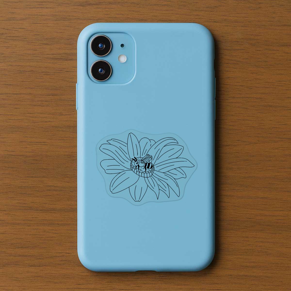'A gentle honeybee hovers near a daisy flower, reminding us of natures delicate balance. Clean lines with a natural charm.'