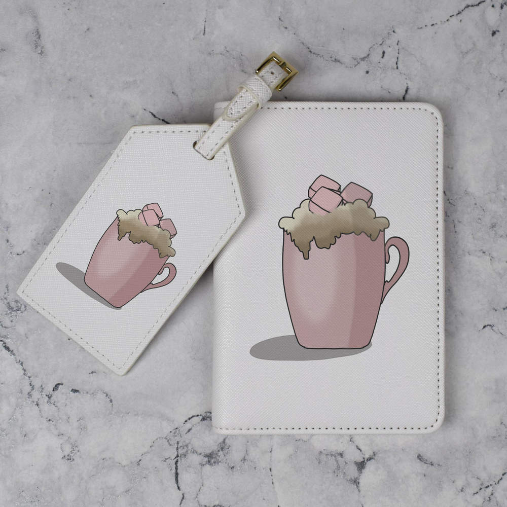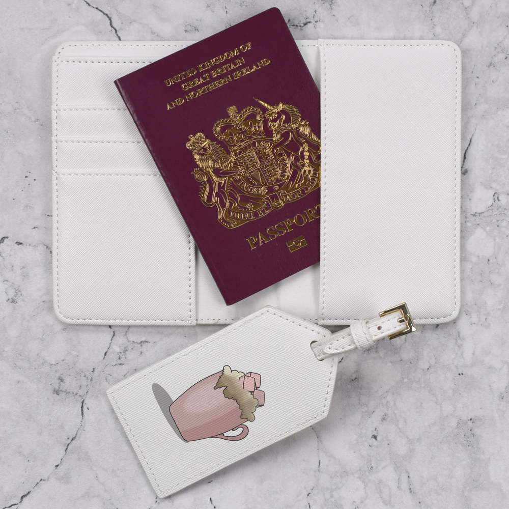 A luxury travel set for holiday makers and jet setters! This premium duo consists of a passport cover and matching luggage tag; both made from white, leather-look PU and printed with a unique design.