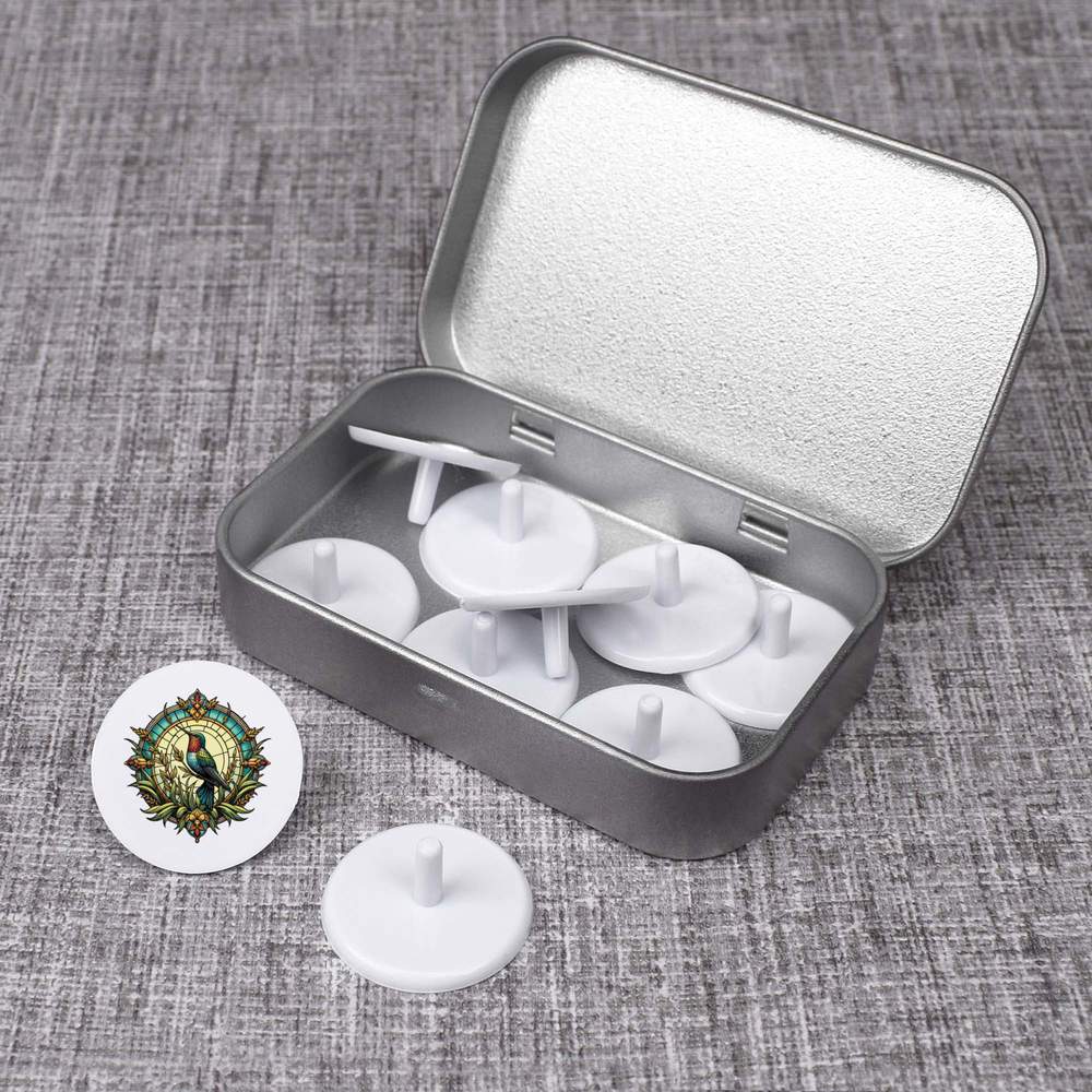 This set includes 1 tin containing 10 matching golf ball markers.