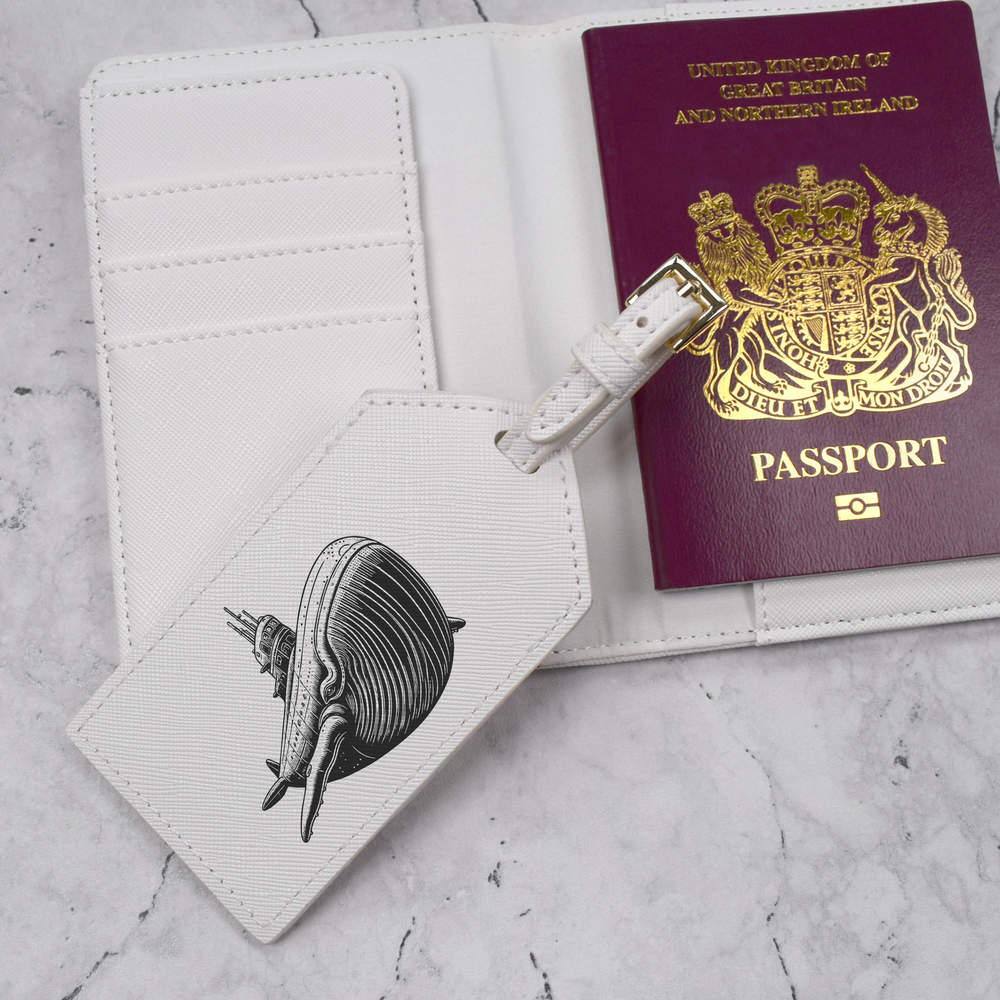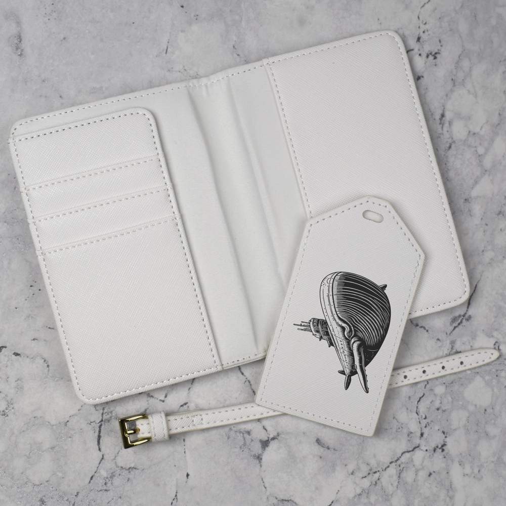 A luxury travel set for holiday makers and jet setters! This premium duo consists of a passport cover and matching luggage tag; both made from white, leather-look PU and printed with a unique design.