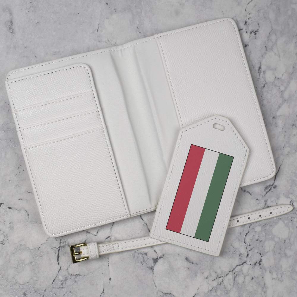 A luxury travel set for holiday makers and jet setters! This premium duo consists of a passport cover and matching luggage tag; both made from white, leather-look PU and printed with a unique design.