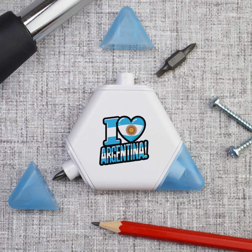 Our triangular compact multi tool is printed on one side with a unique design, making it a great gift for DIY lovers. This 3-in-1 tool set contains a tape measure and 2 different screwdriver attachments and each corner has a snap shut lid. One corner reveals a 1 meter tape measure, while the others hide two reversible screwdriver attachments, one larger and one smaller, both of which have a cross head on one end and a flat head on the other.