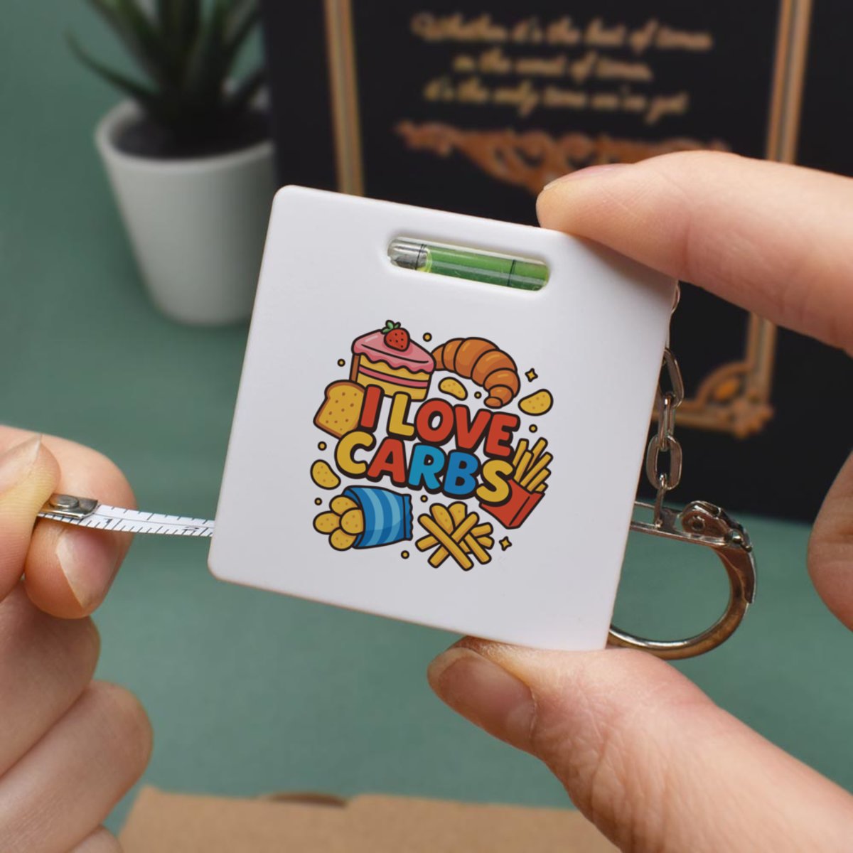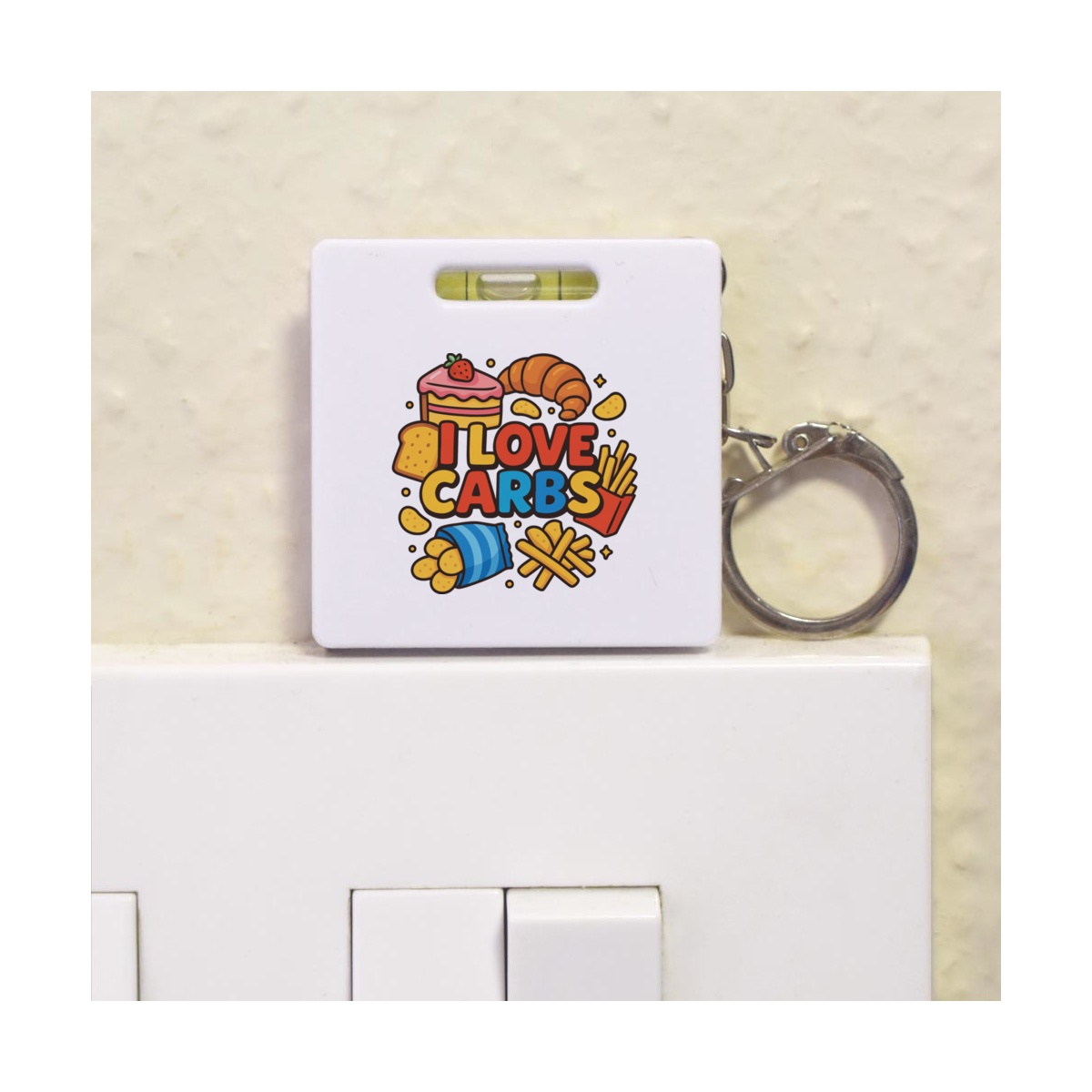 This multifunctional tool offers both a tape measure and spirit level in one handy little accessory. The retractable, 1 metre tape measure has both imperial and metric units, while the flat edges around its plastic casing provide the ability to check both vertical and horizontal surfaces with a mini spirit level. The compact and lightweight design makes it easy to carry around; simply attach with the keychain provided and whip it out when needed. Each keyring tape measure tool is printed on one side with a unique design.