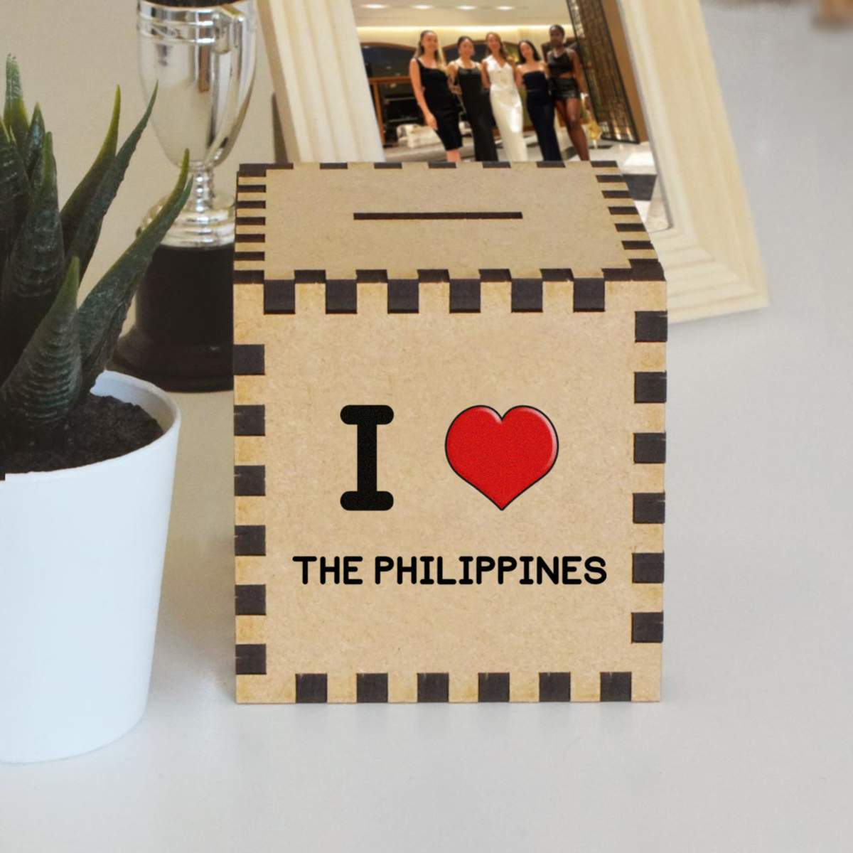 An 8.5cm wooden money box made out of the finest quality MDF and printed on all four sides with a unique design. The bottom is flat and the top has a slot for coins, the box itself is 85mm on each side, with a 35mm x 5mm coin slot, so please be sure it's suitable for you.
