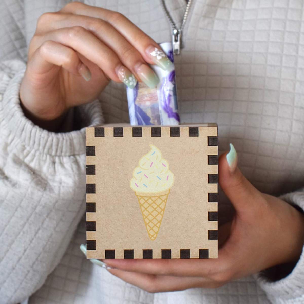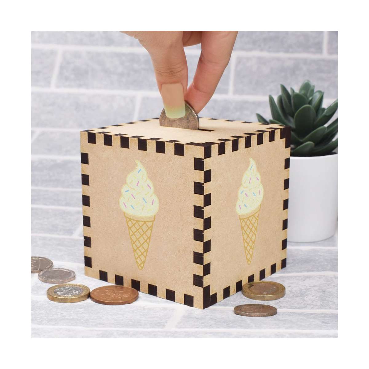 An 8.5cm wooden money box made out of the finest quality MDF and printed on all four sides with a unique design. The bottom is flat and the top has a slot for coins, the box itself is 85mm on each side, with a 35mm x 5mm coin slot, so please be sure it's suitable for you.