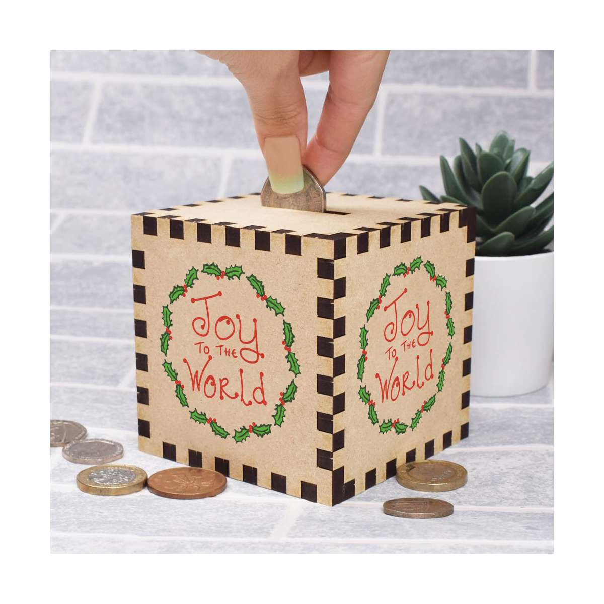 An 8.5cm wooden money box made out of the finest quality MDF and printed on all four sides with a unique design. The bottom is flat and the top has a slot for coins, the box itself is 85mm on each side, with a 35mm x 5mm coin slot, so please be sure it's suitable for you.