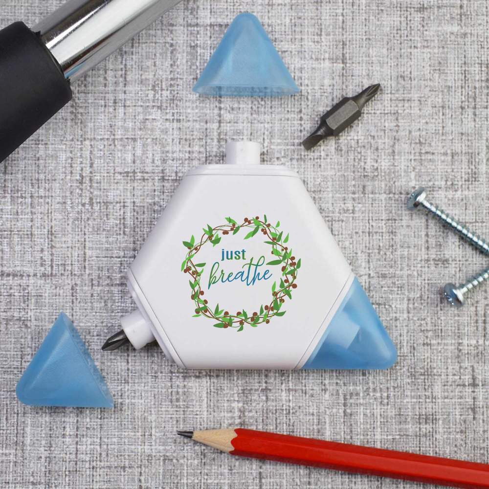 Our triangular compact multi tool is printed on one side with a unique design, making it a great gift for DIY lovers. This 3-in-1 tool set contains a tape measure and 2 different screwdriver attachments and each corner has a snap shut lid. One corner reveals a 1 meter tape measure, while the others hide two reversible screwdriver attachments, one larger and one smaller, both of which have a cross head on one end and a flat head on the other.
