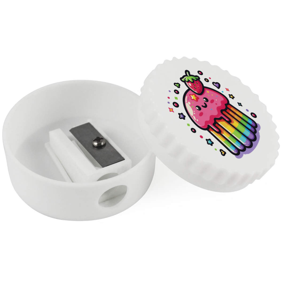 Keep your pencils sharp and ready to use with this sturdy, single hole sharpener featuring one of our awesome designs. The twisting lid conceals the hole to the blade and removes completely to allow shavings to be discarded.