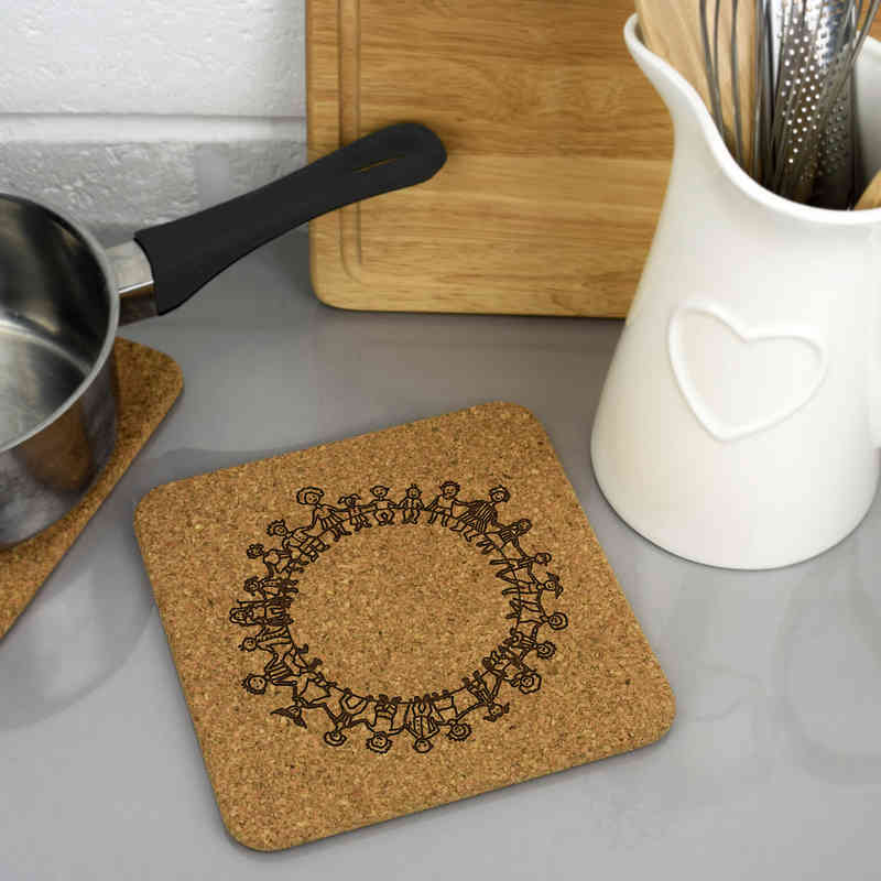 This wonderful square cork trivet / mat is a great addition to any kitchen. The cork is naturally non-slip and resistant to heat making it the perfect material to protect your kitchen worktops. Engraved on one side with a unique design, this product would make a fantastic gift and homeware essential.