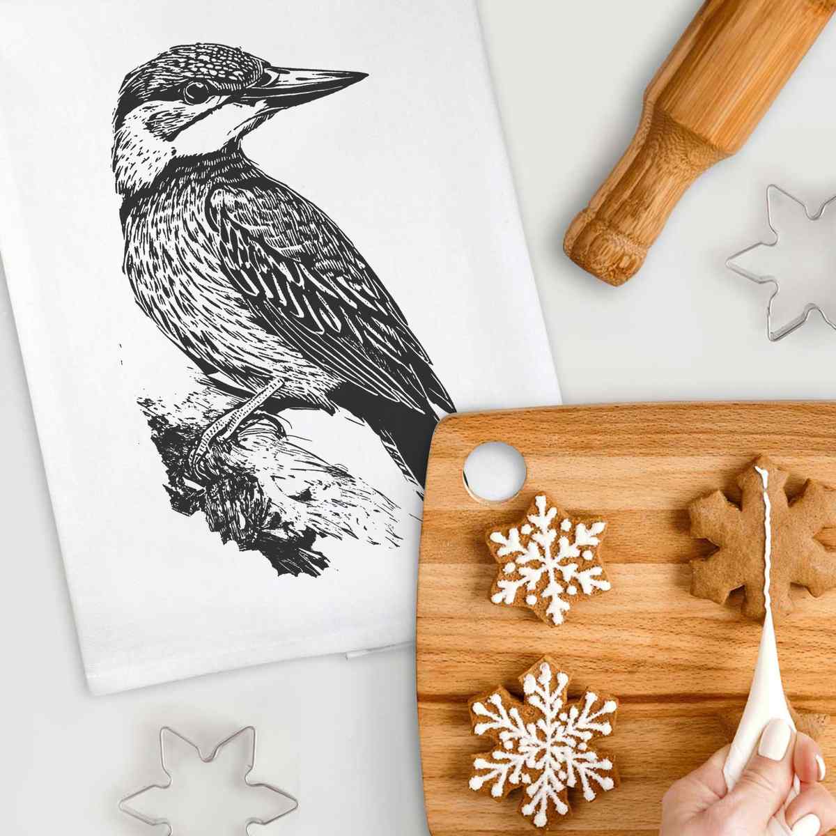 - White cotton tea towel with hanging loop