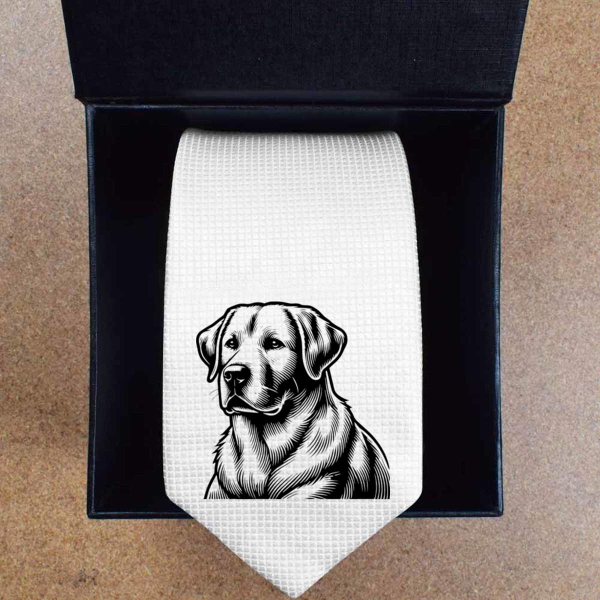 - Slim white tie with black presentation box