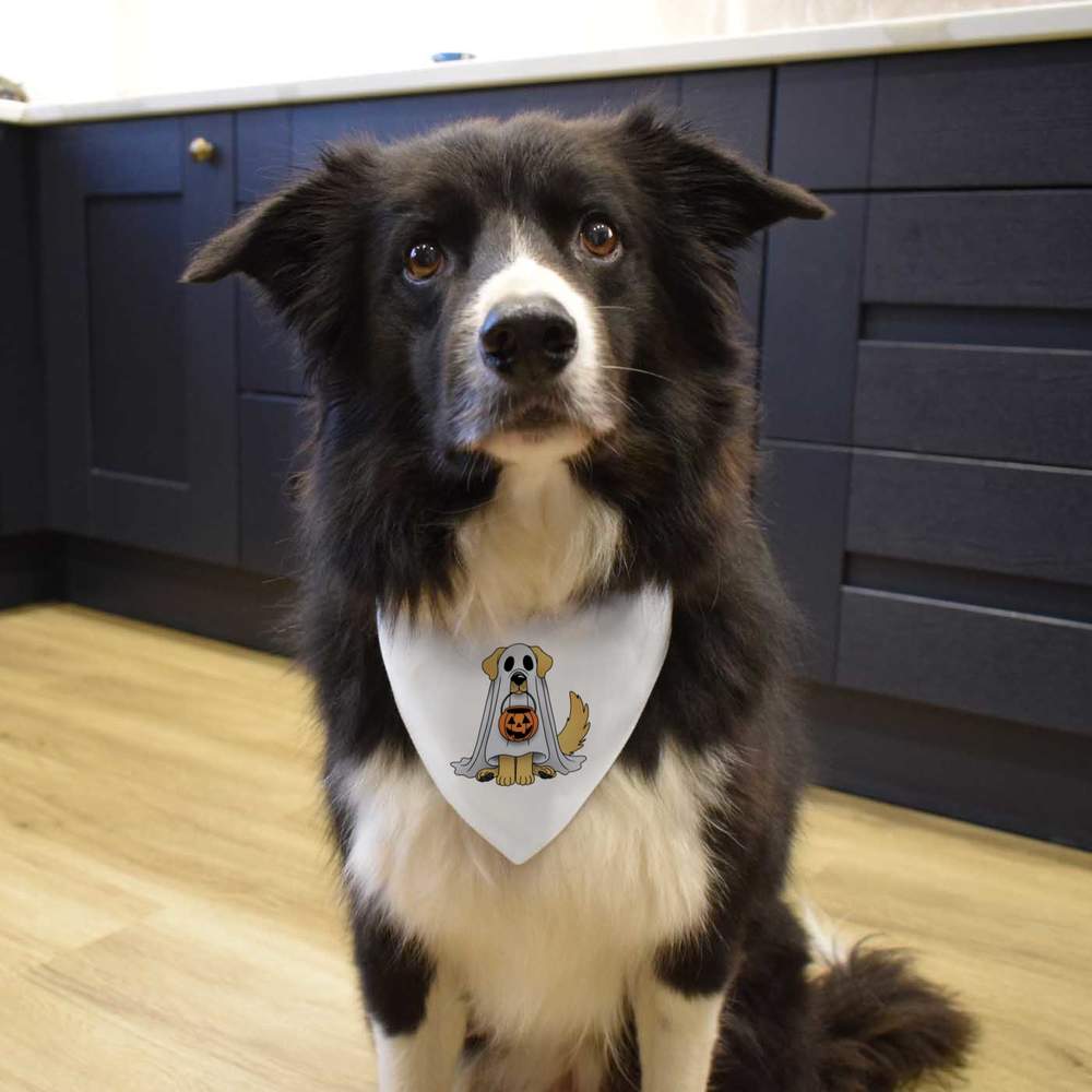 'A cute dog dressed as a ghost for Halloween.'