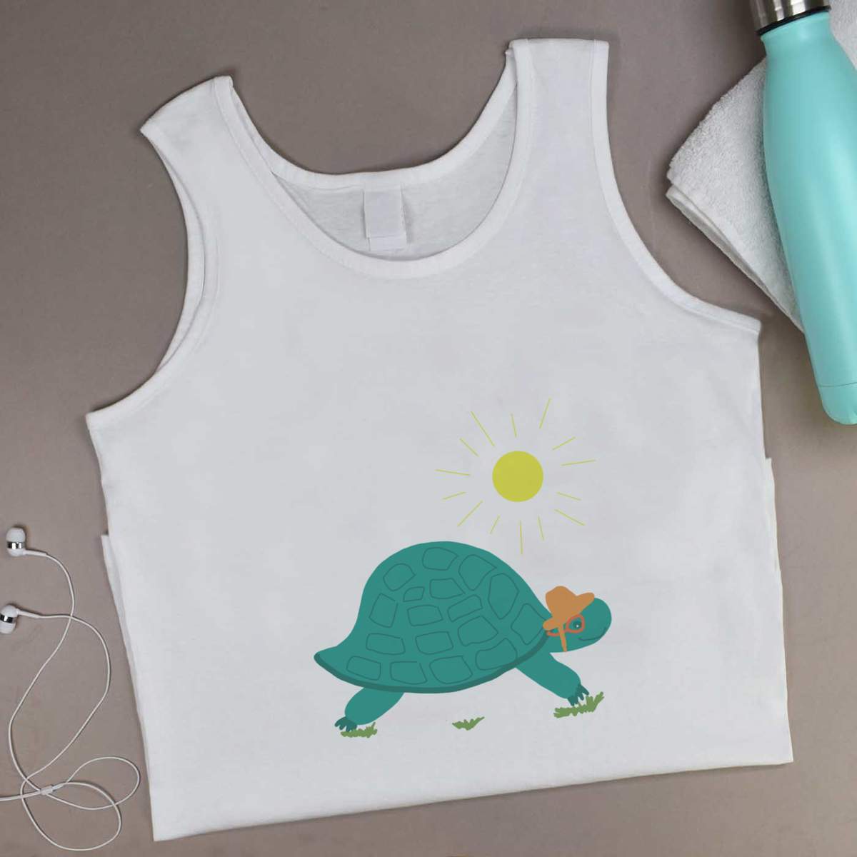 'tortoise, sun, glasses, hat.'
