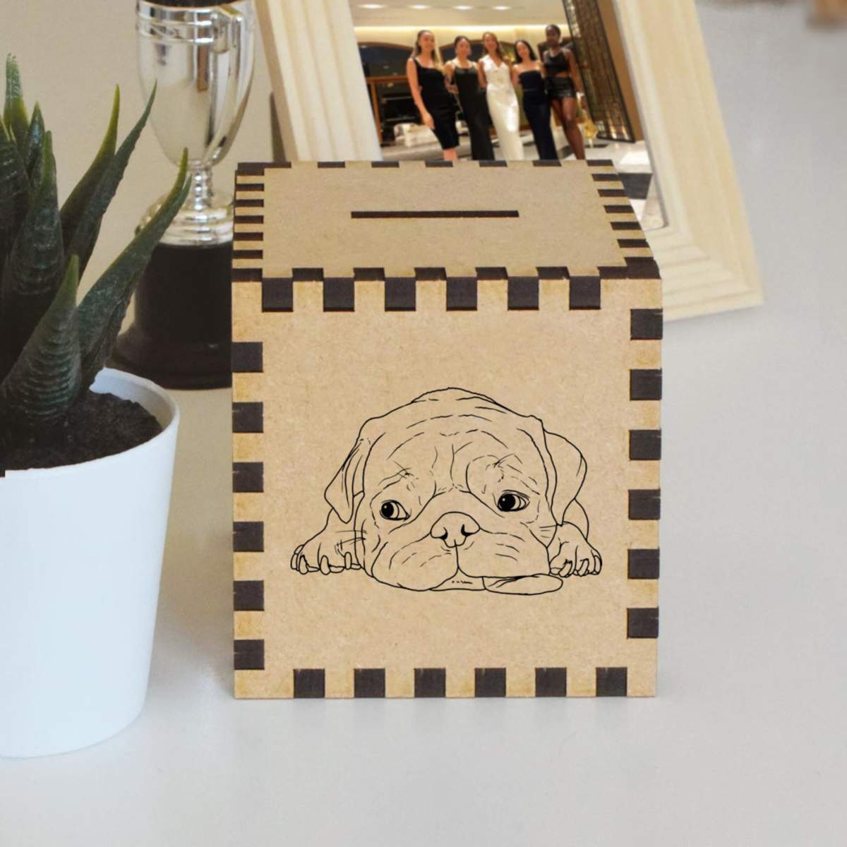 An 8.5cm wooden money box made out of the finest quality MDF and printed on all four sides with a unique design. The bottom is flat and the top has a slot for coins, the box itself is 85mm on each side, with a 35mm x 5mm coin slot, so please be sure it's suitable for you.