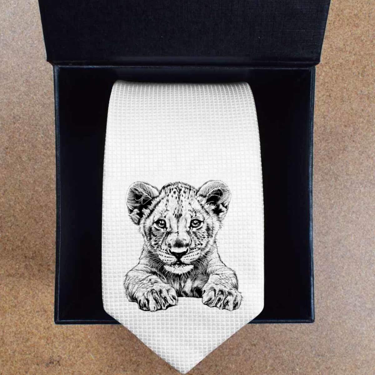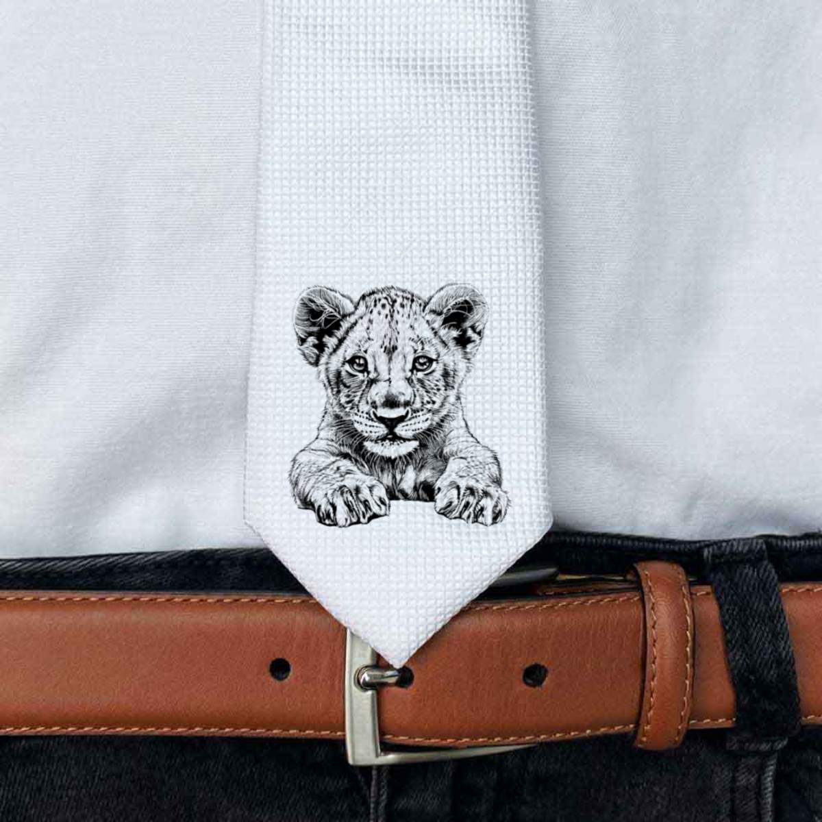 This stylish slim white tie is guaranteed to add class to any outfit. Printed on the front with a design from one of our talented designers, these ties are perfect for formal events, special occasions or making a statement at the office.