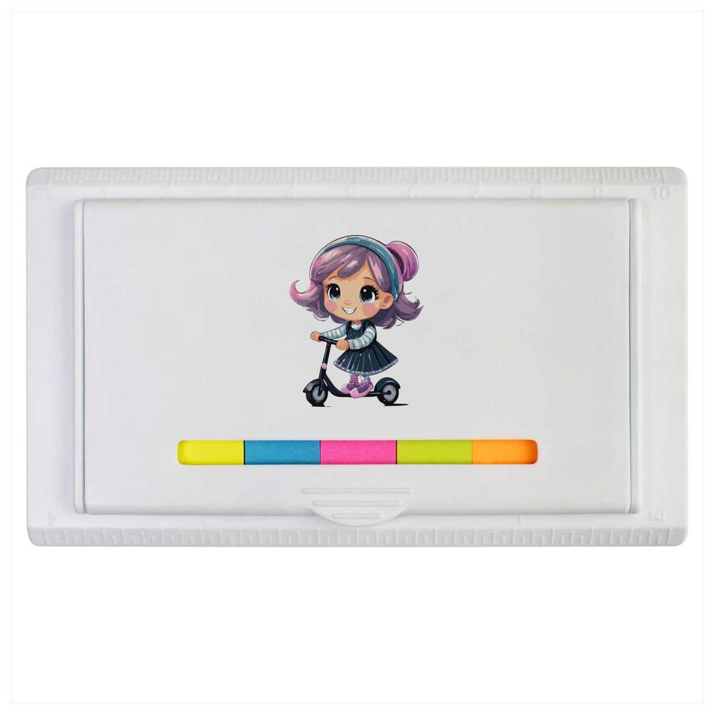 This sticky note ruler pad is a useful desktop accessory; the white plastic case has a flip top lid which reveals 7 colours of slim sticky note tabs. There are approximately 25 sticky notes in each colour, ideal for writing notes on and marking pages. Both edges of the plastic case are embossed with ruler markings; imperial on one side (0 - 4 inches) and metric on the other (0 - 10cm). Each case is printed on the flip top lid with a unique design, making it great gift for students and office workers.