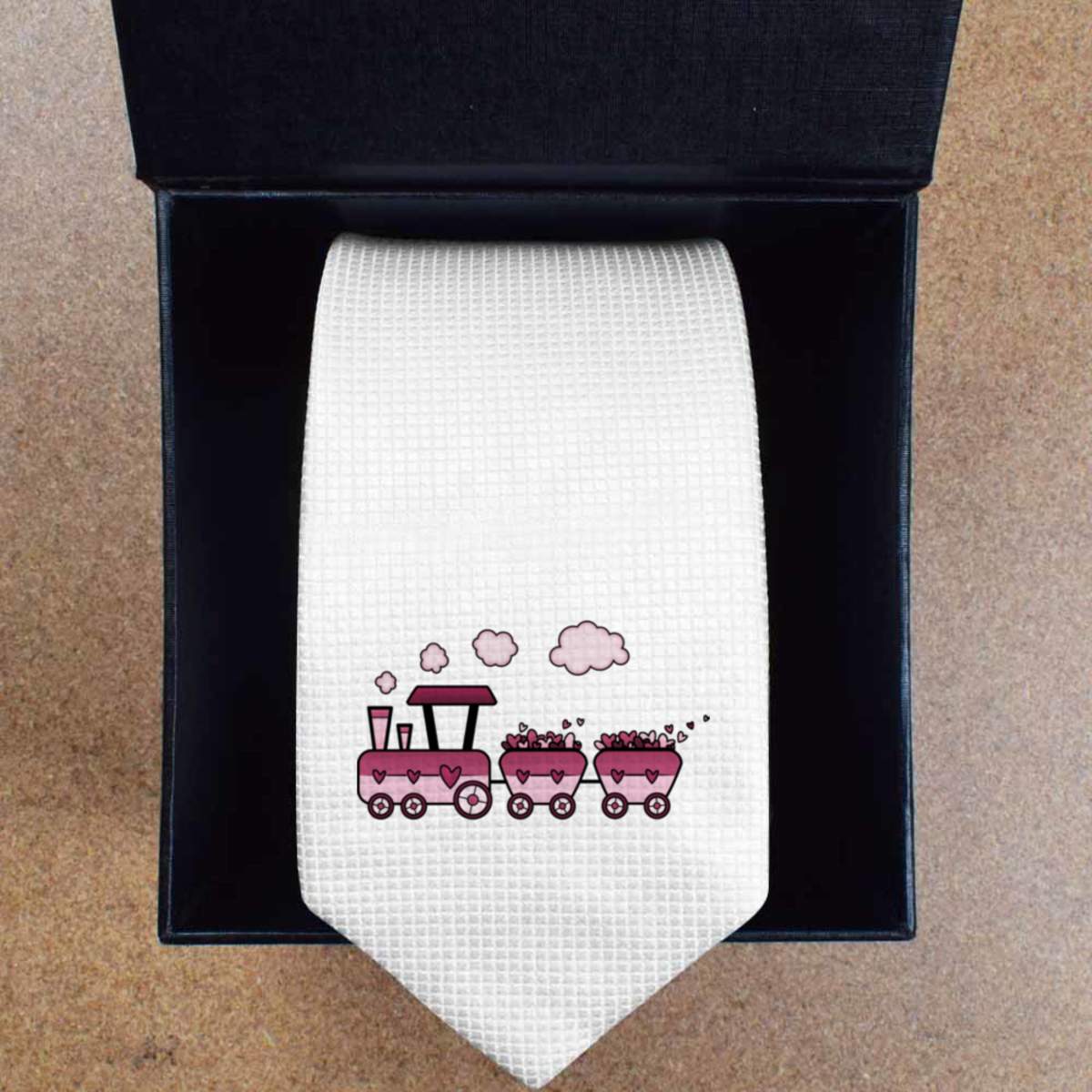 - Slim white tie with black presentation box