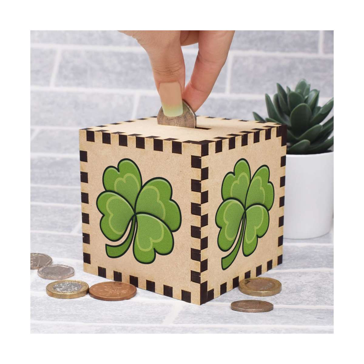 An 8.5cm wooden money box made out of the finest quality MDF and printed on all four sides with a unique design. The bottom is flat and the top has a slot for coins, the box itself is 85mm on each side, with a 35mm x 5mm coin slot, so please be sure it's suitable for you.