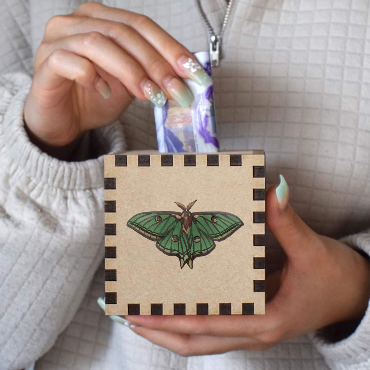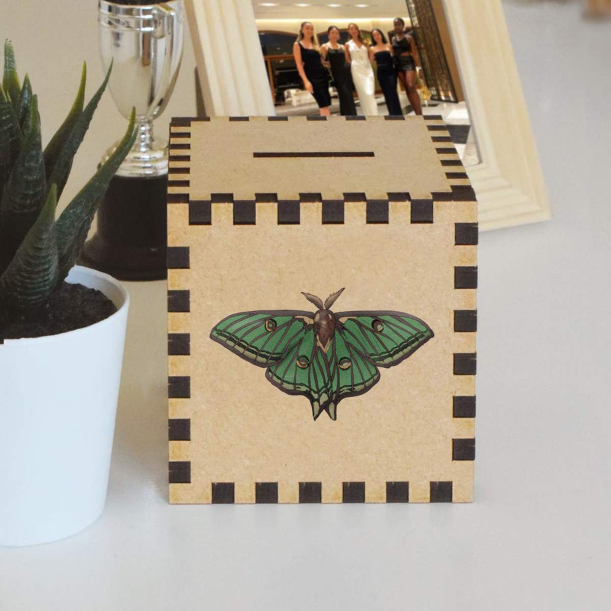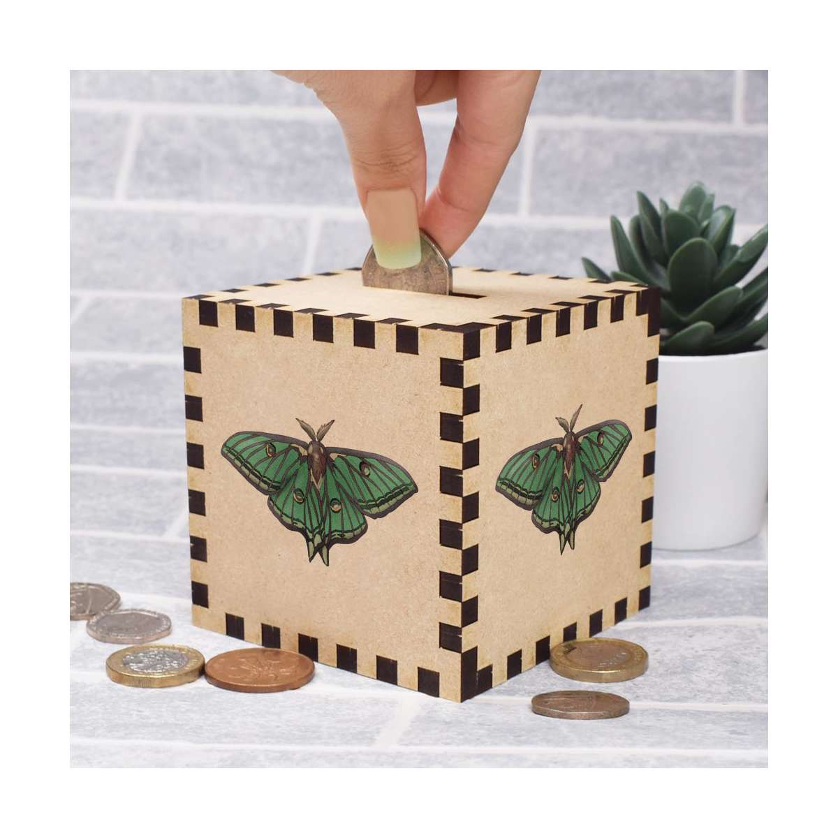 An 8.5cm wooden money box made out of the finest quality MDF and printed on all four sides with a unique design. The bottom is flat and the top has a slot for coins, the box itself is 85mm on each side, with a 35mm x 5mm coin slot, so please be sure it's suitable for you.