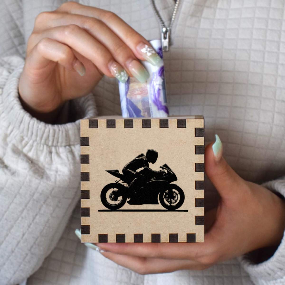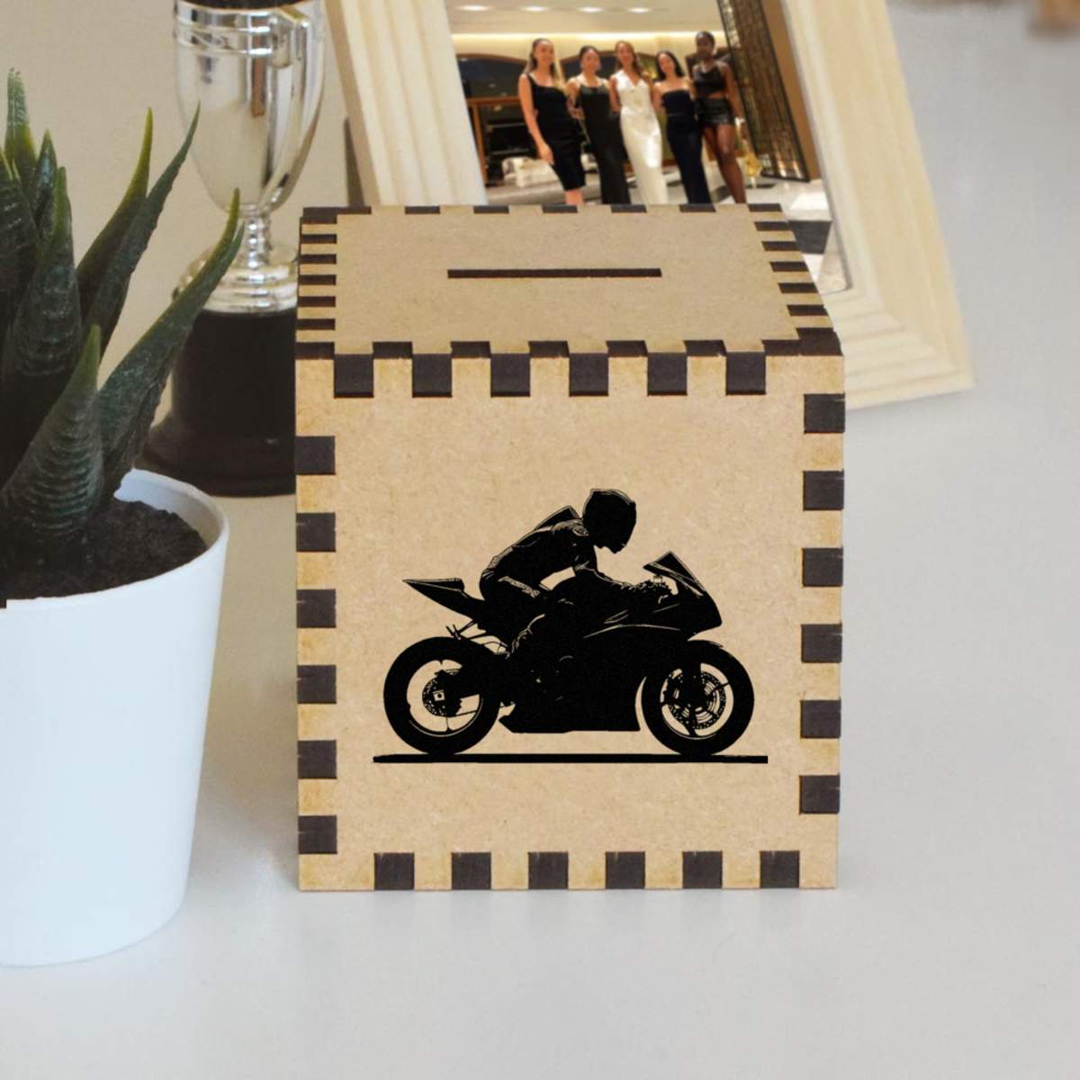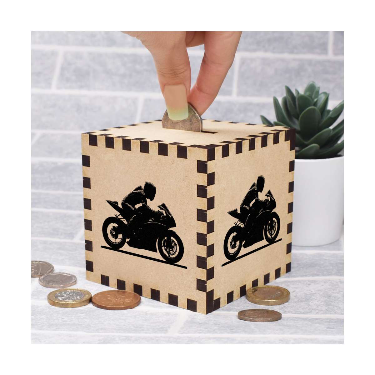 An 8.5cm wooden money box made out of the finest quality MDF and printed on all four sides with a unique design. The bottom is flat and the top has a slot for coins, the box itself is 85mm on each side, with a 35mm x 5mm coin slot, so please be sure it's suitable for you.