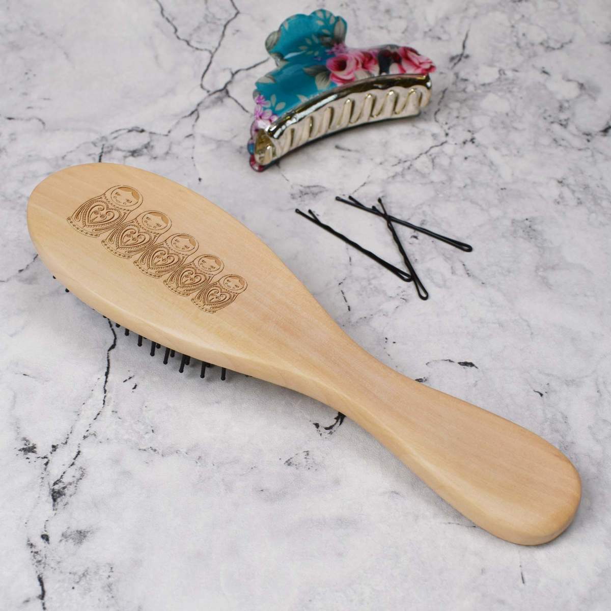 A must-have accessory for long haired ladies and gents, our fabulous hairbrushes are made from natural wood with a smooth finish for a comfortable grip while the black plastic pins are slim and stiff enough to tease through those tangles. Each hairbrush is engraved on the back with a unique design, making it a great gift idea for friends or family.