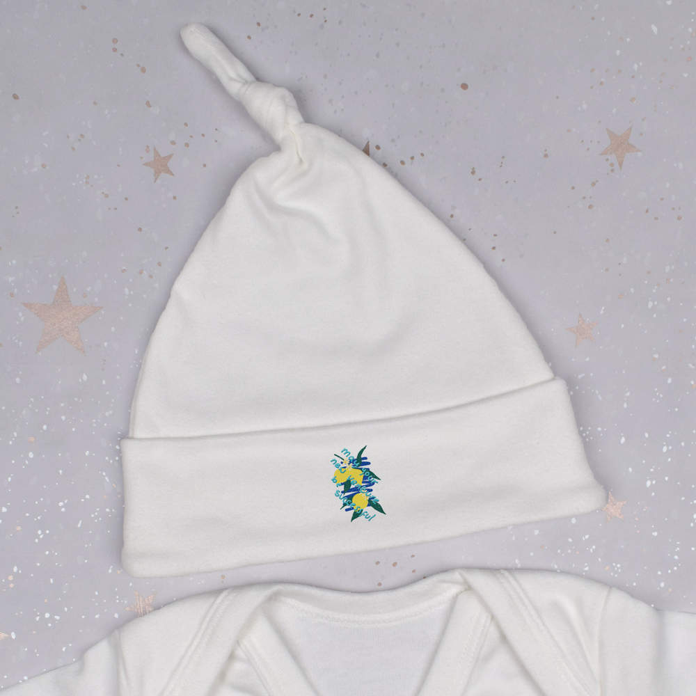 Keep little ones cosy and stylish with this super soft beanie hat. Our baby beanie hats have a knotted top and are printed on the turnover with a unique design. Made from 100% cotton, it can be machine washed and still retain its shape. This beanie hat has a stretch fit so one size fits all, with an approximate circumference of 32cm, it's ideal for babies up to 12 months old.