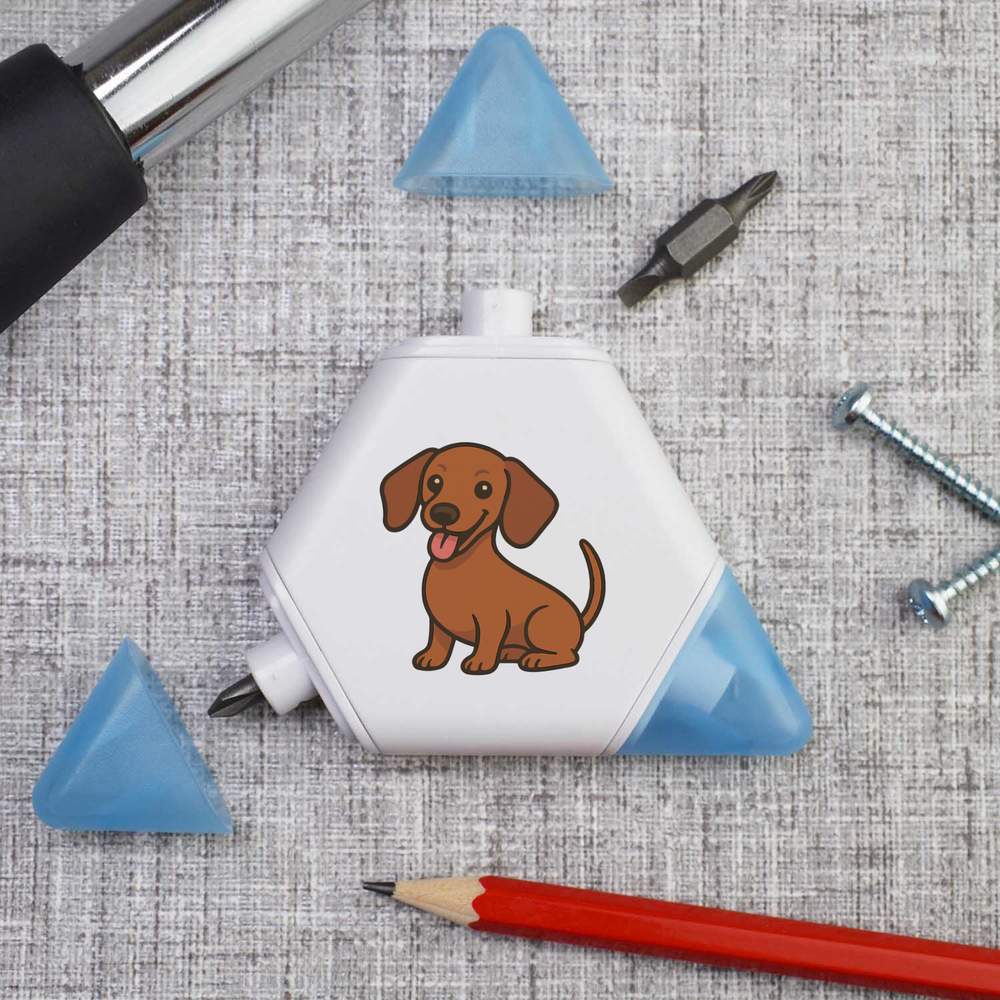 Our triangular compact multi tool is printed on one side with a unique design, making it a great gift for DIY lovers. This 3-in-1 tool set contains a tape measure and 2 different screwdriver attachments and each corner has a snap shut lid. One corner reveals a 1 meter tape measure, while the others hide two reversible screwdriver attachments, one larger and one smaller, both of which have a cross head on one end and a flat head on the other.