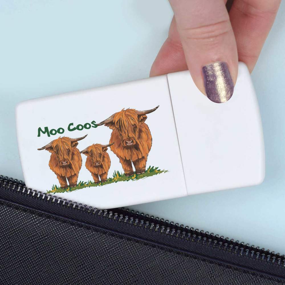 'Digital illustration of a group of highland cows with text that says 'Moo Coos'.'