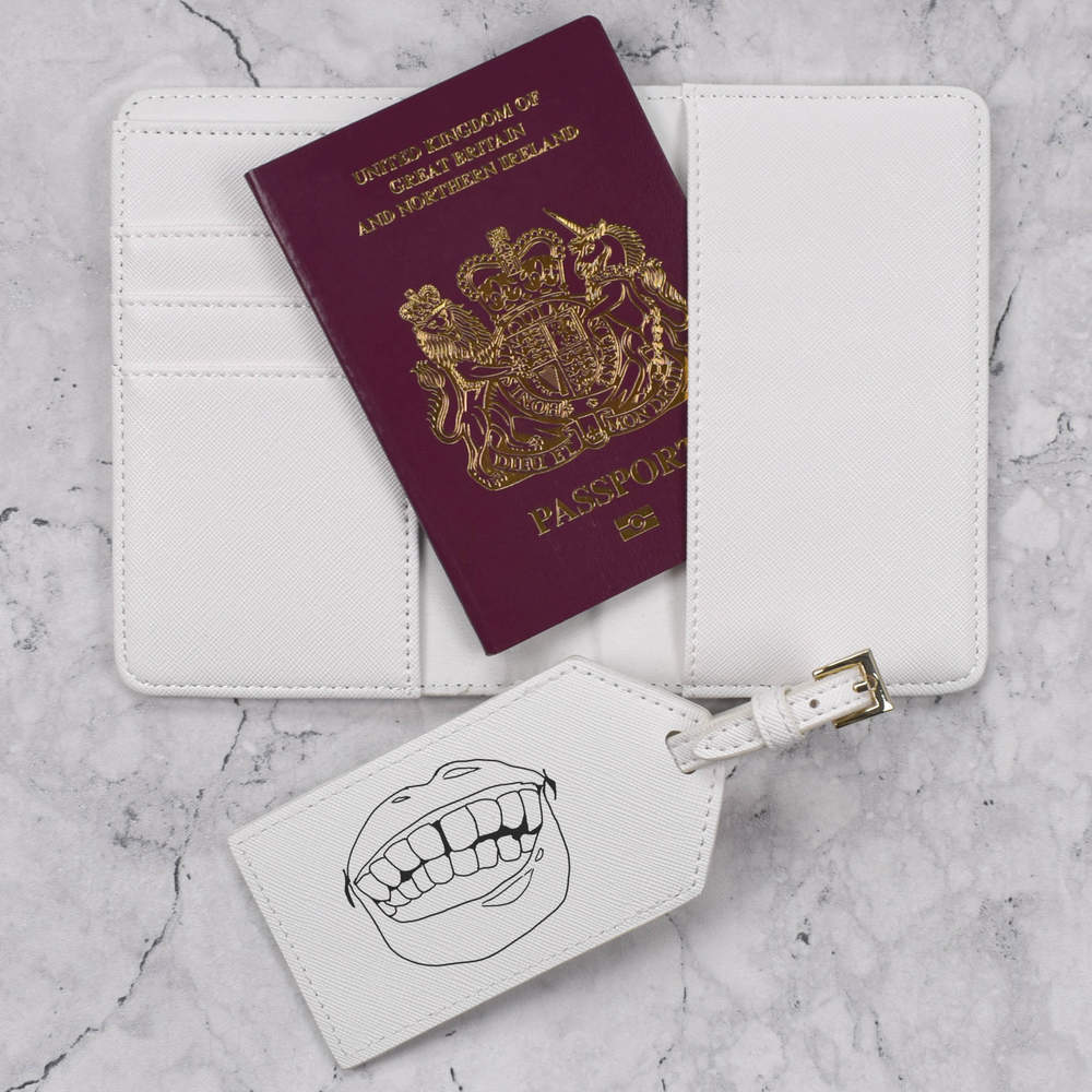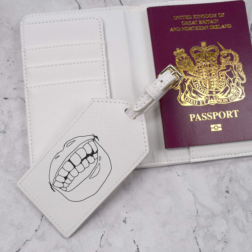 A luxury travel set for holiday makers and jet setters! This premium duo consists of a passport cover and matching luggage tag; both made from white, leather-look PU and printed with a unique design.
