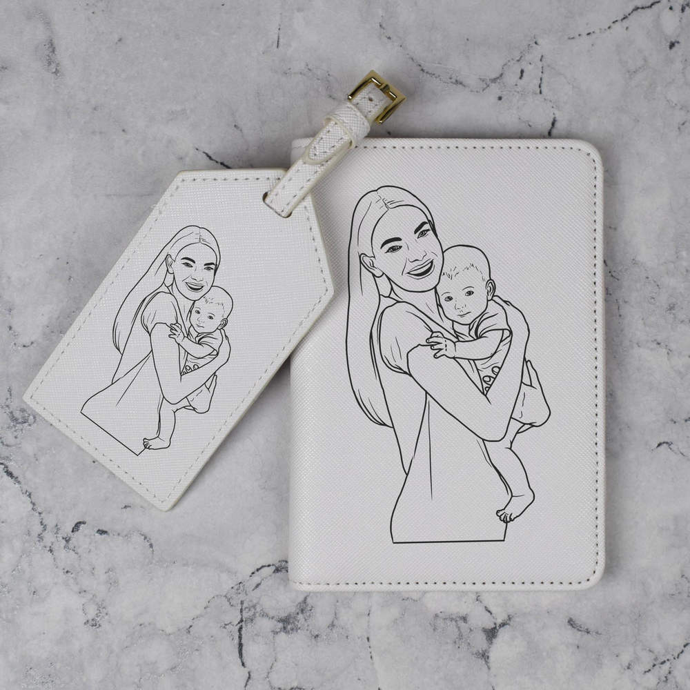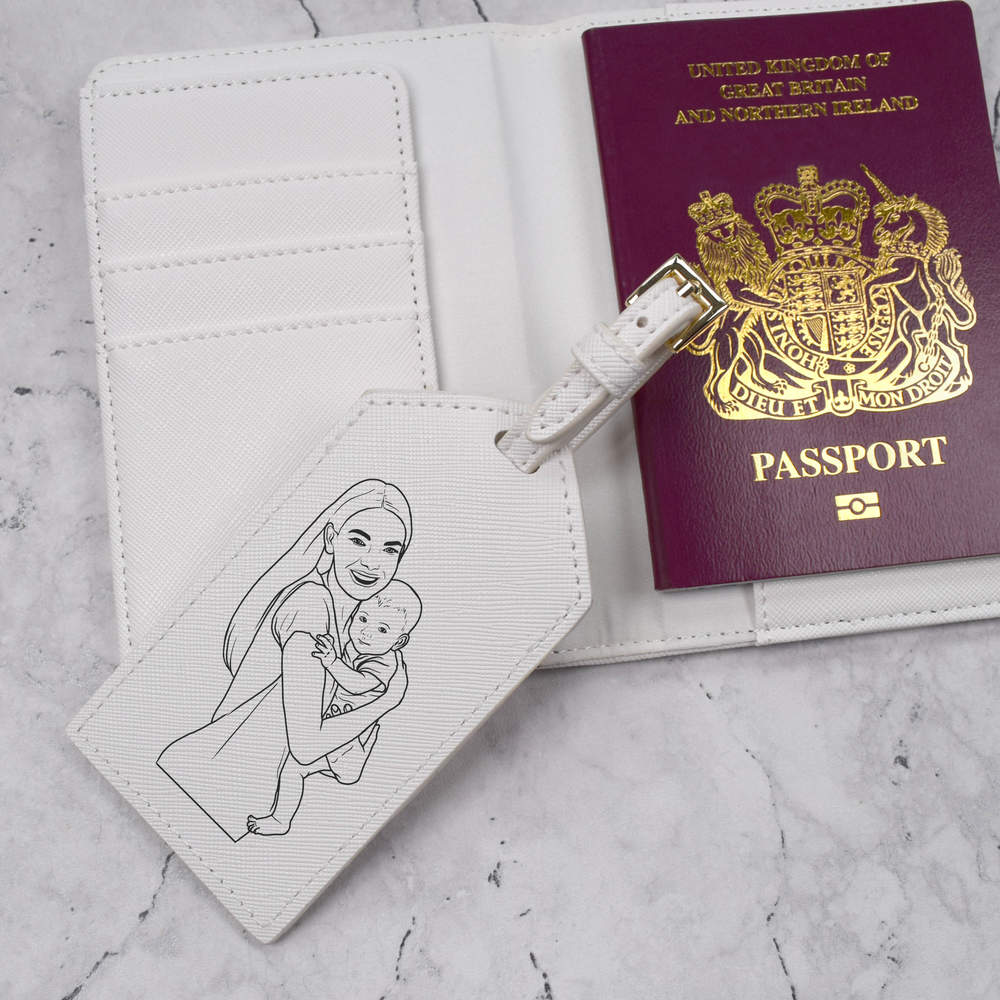 A luxury travel set for holiday makers and jet setters! This premium duo consists of a passport cover and matching luggage tag; both made from white, leather-look PU and printed with a unique design.