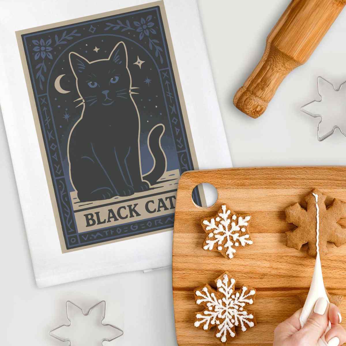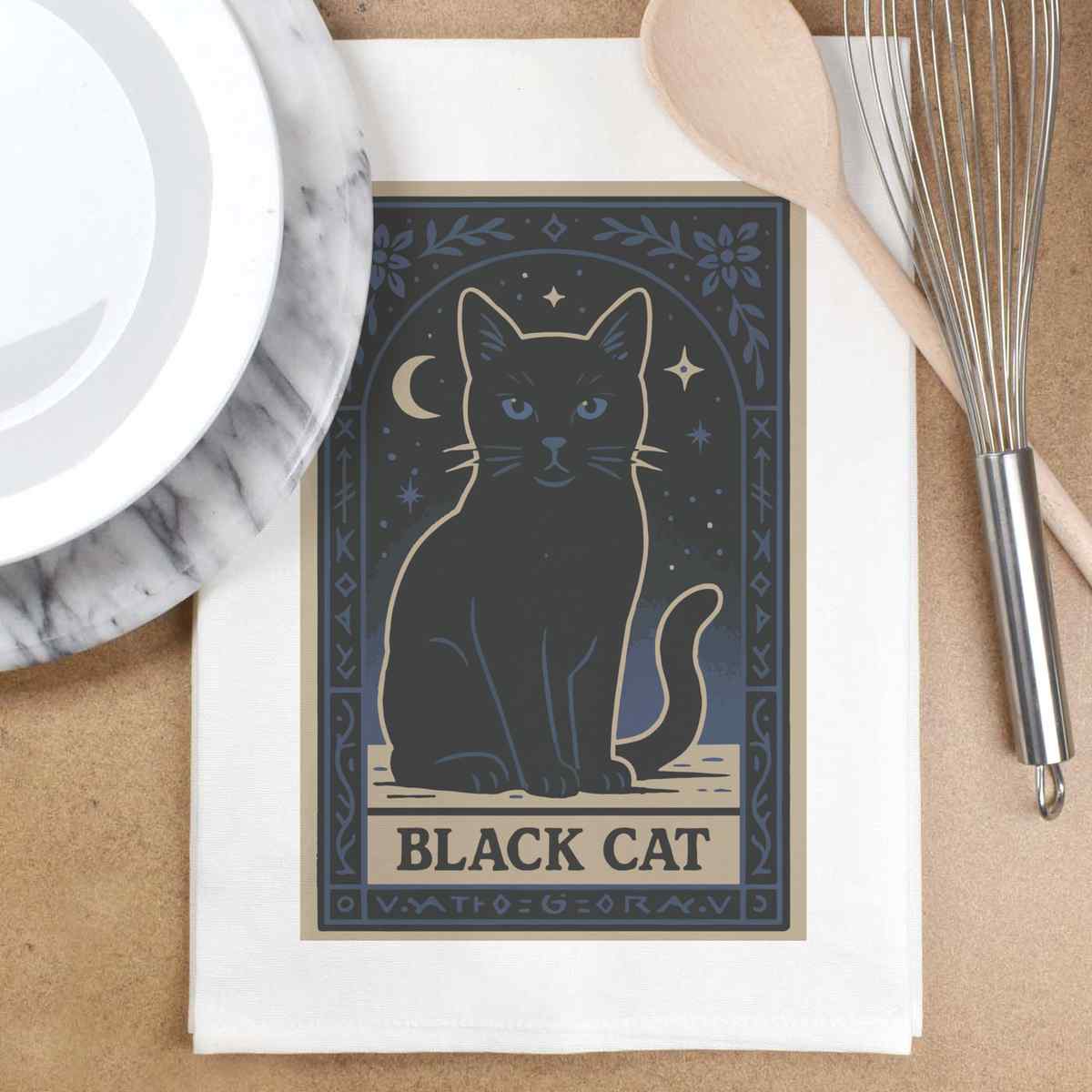 'A captivating design featuring a mysterious black cat surrounded by mystical elements, perfect for those enchanted by feline charm and the occult.'