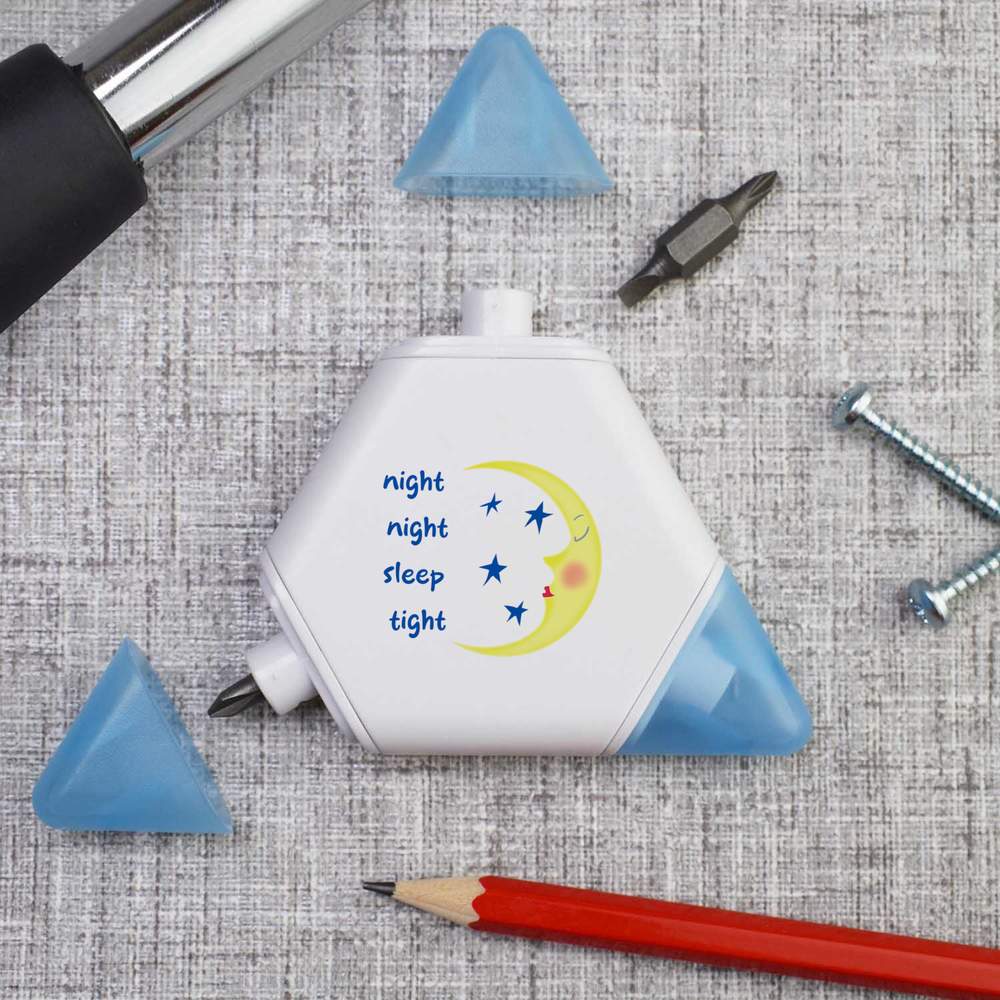 Our triangular compact multi tool is printed on one side with a unique design, making it a great gift for DIY lovers. This 3-in-1 tool set contains a tape measure and 2 different screwdriver attachments and each corner has a snap shut lid. One corner reveals a 1 meter tape measure, while the others hide two reversible screwdriver attachments, one larger and one smaller, both of which have a cross head on one end and a flat head on the other.
