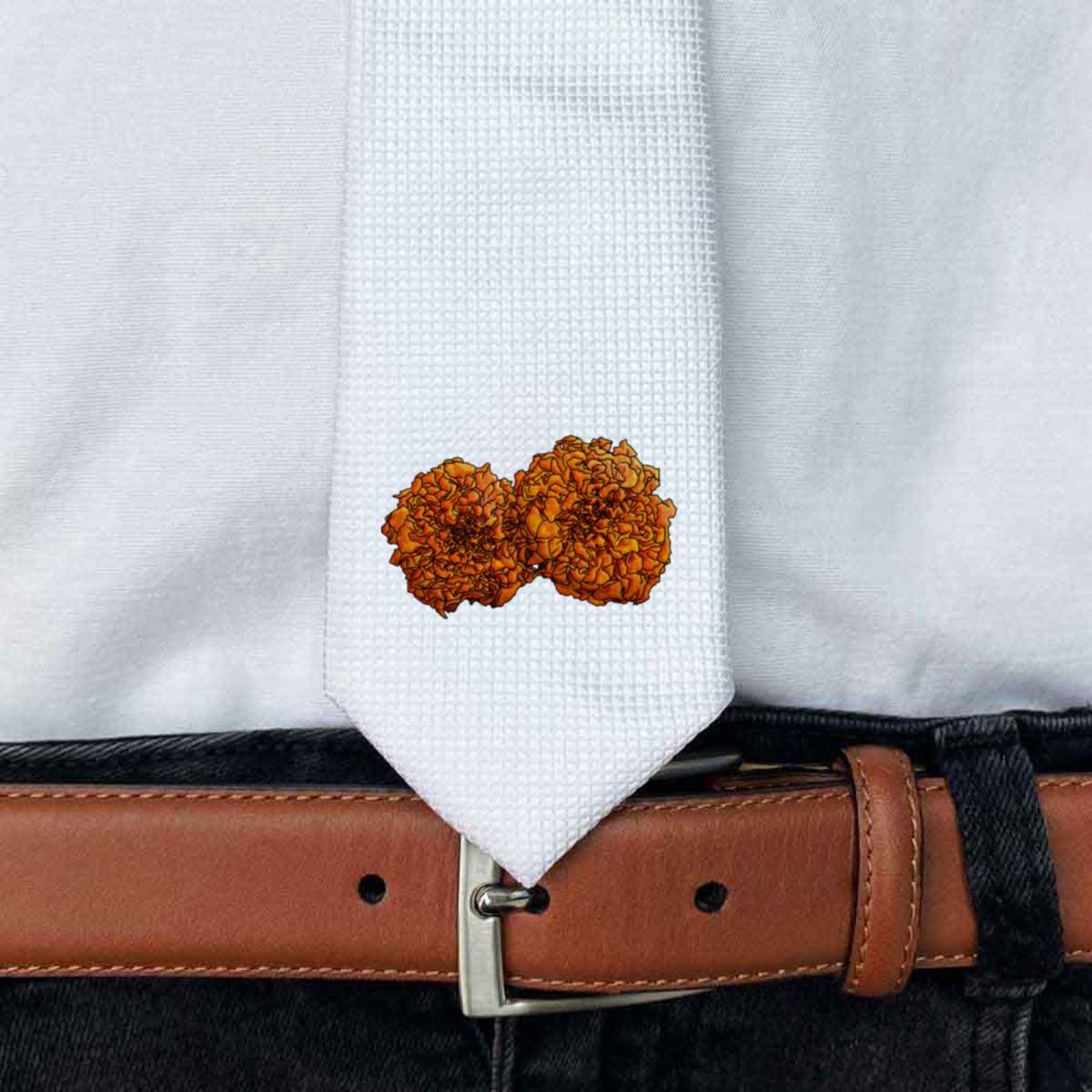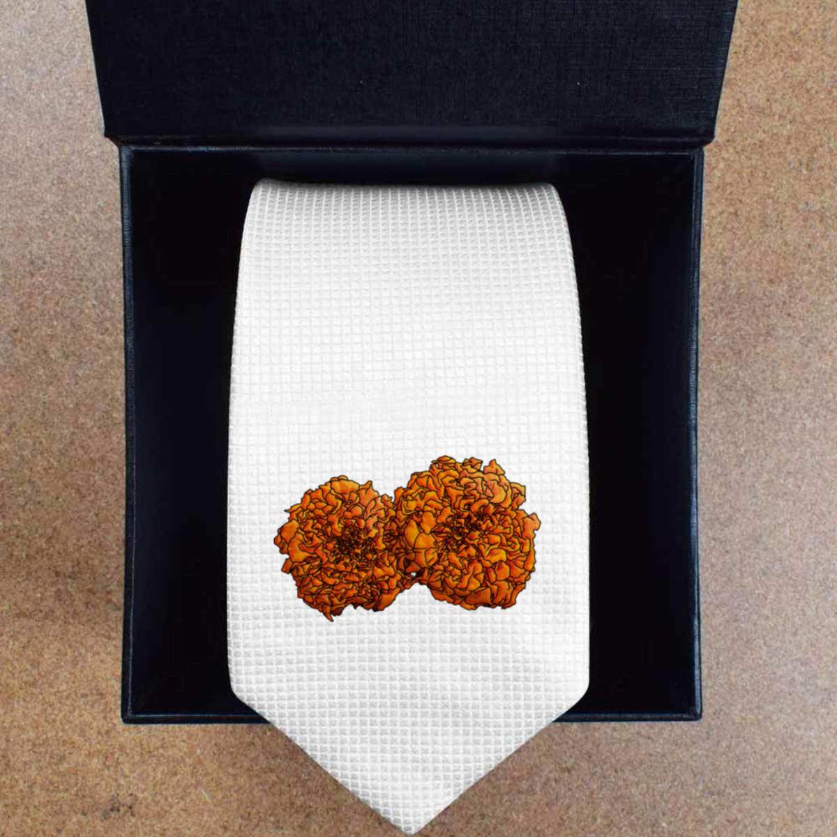 'Orange Marigolds' White Tie / Necktie with Gift Box (AT00011337)