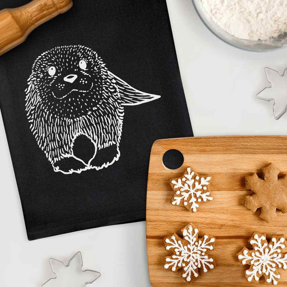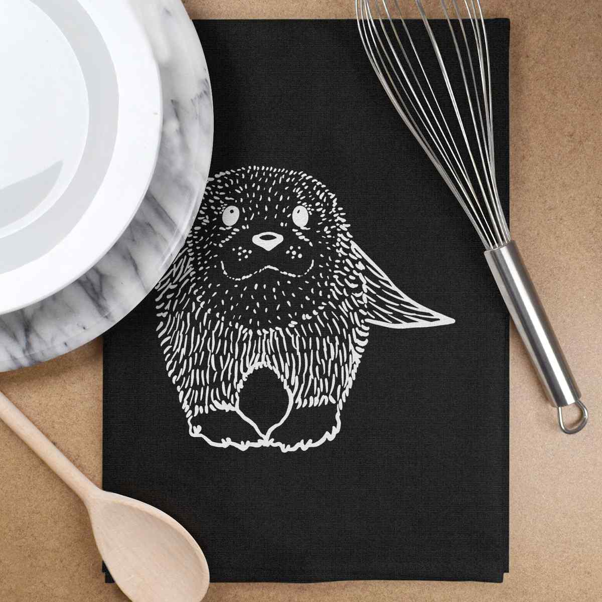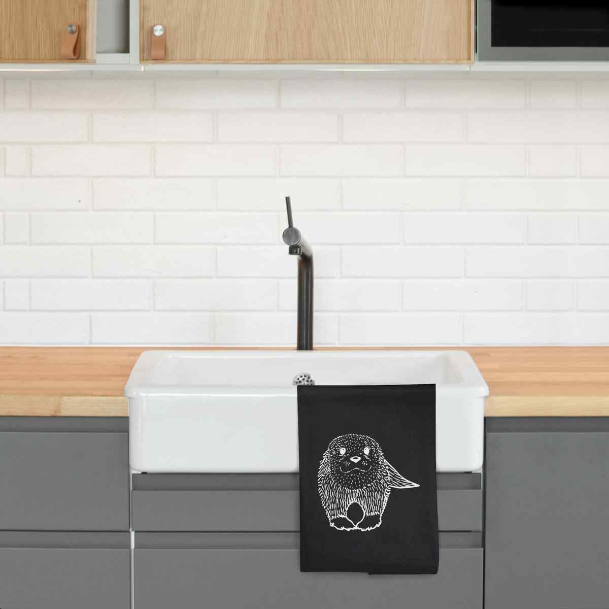 - Black cotton tea towel with hanging loop