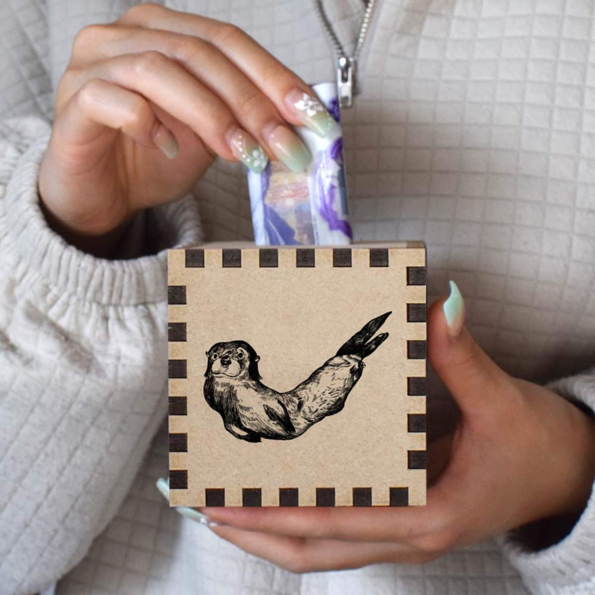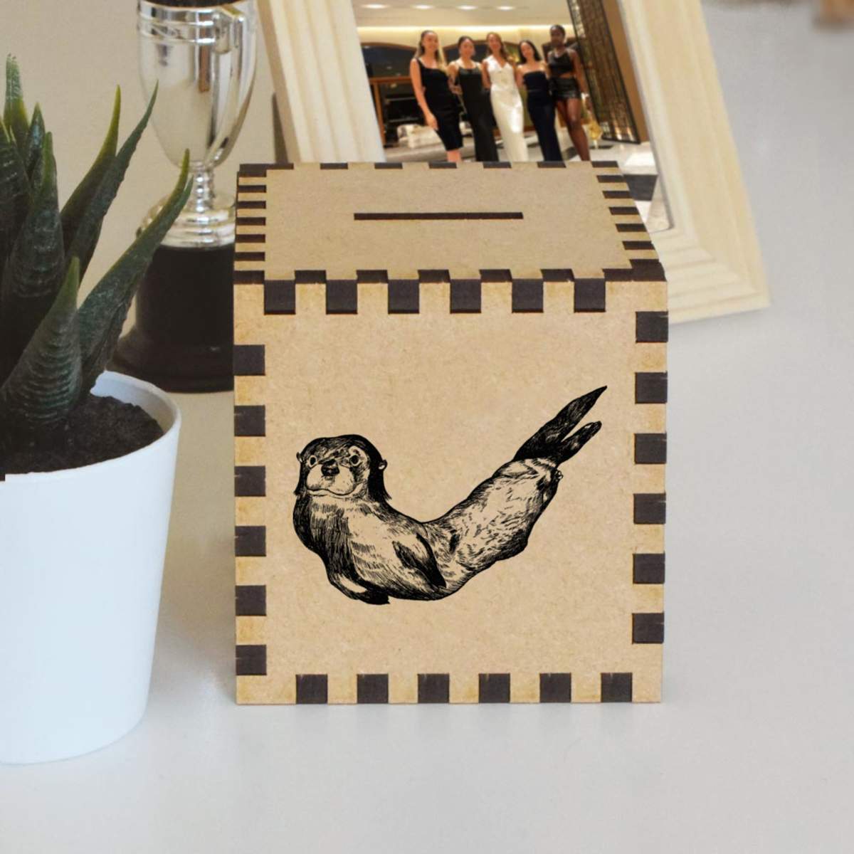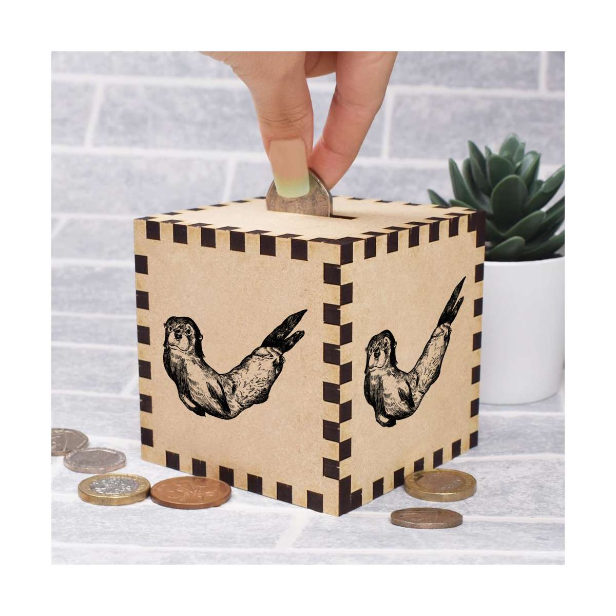 An 8.5cm wooden money box made out of the finest quality MDF and printed on all four sides with a unique design. The bottom is flat and the top has a slot for coins, the box itself is 85mm on each side, with a 35mm x 5mm coin slot, so please be sure it's suitable for you.