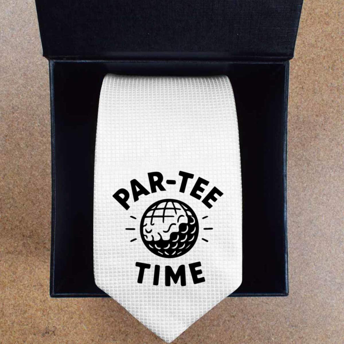 'The words 'Par-Tee Time' with a golf and disco ball.'