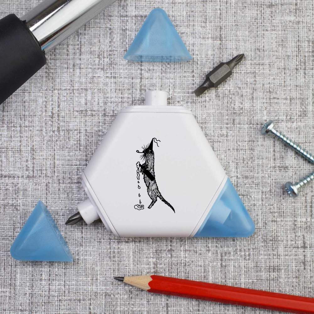 Our triangular compact multi tool is printed on one side with a unique design, making it a great gift for DIY lovers. This 3-in-1 tool set contains a tape measure and 2 different screwdriver attachments and each corner has a snap shut lid. One corner reveals a 1 meter tape measure, while the others hide two reversible screwdriver attachments, one larger and one smaller, both of which have a cross head on one end and a flat head on the other.