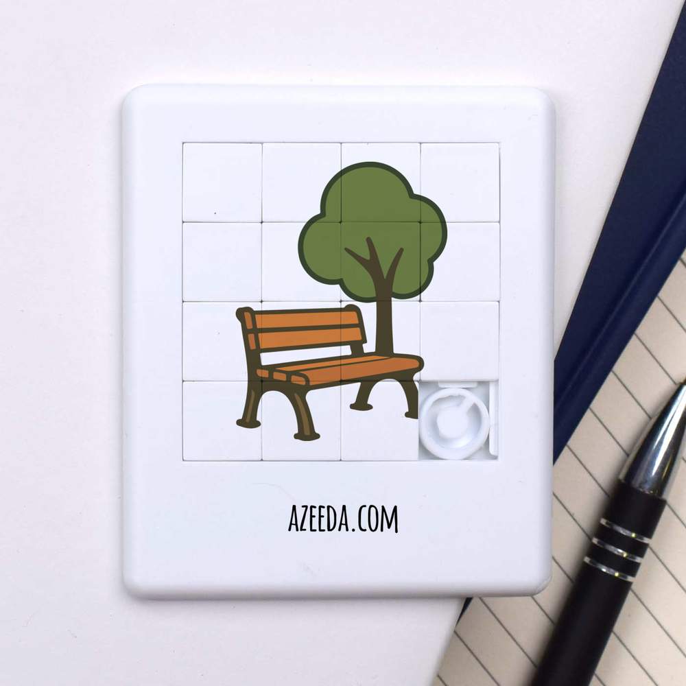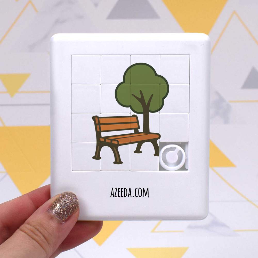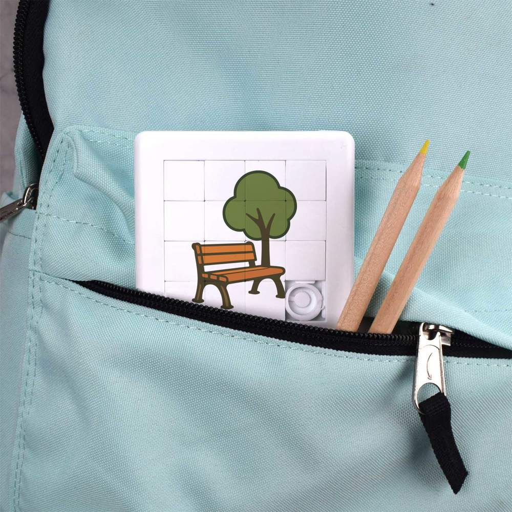 - Pocket sized puzzle with sliding square pieces