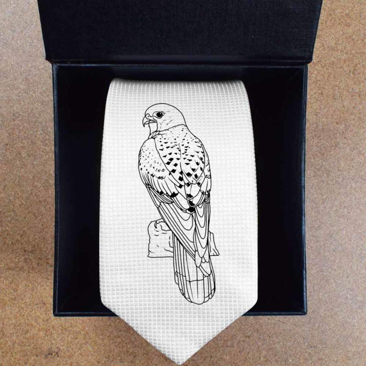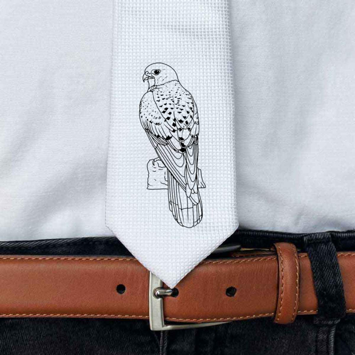 This stylish slim white tie is guaranteed to add class to any outfit. Printed on the front with a design from one of our talented designers, these ties are perfect for formal events, special occasions or making a statement at the office.