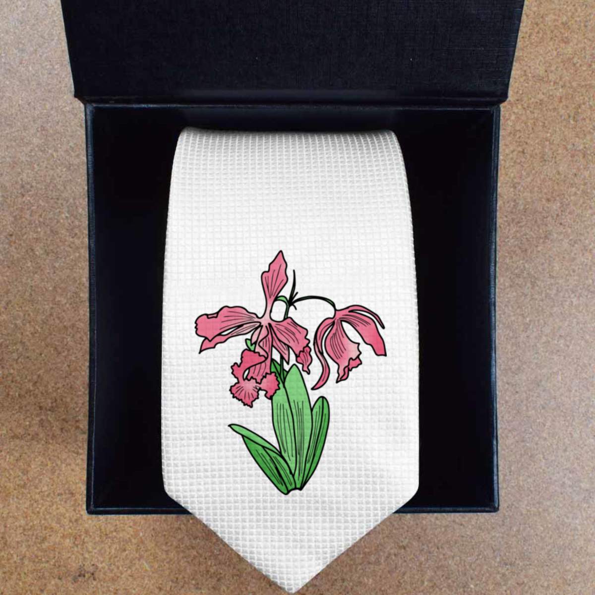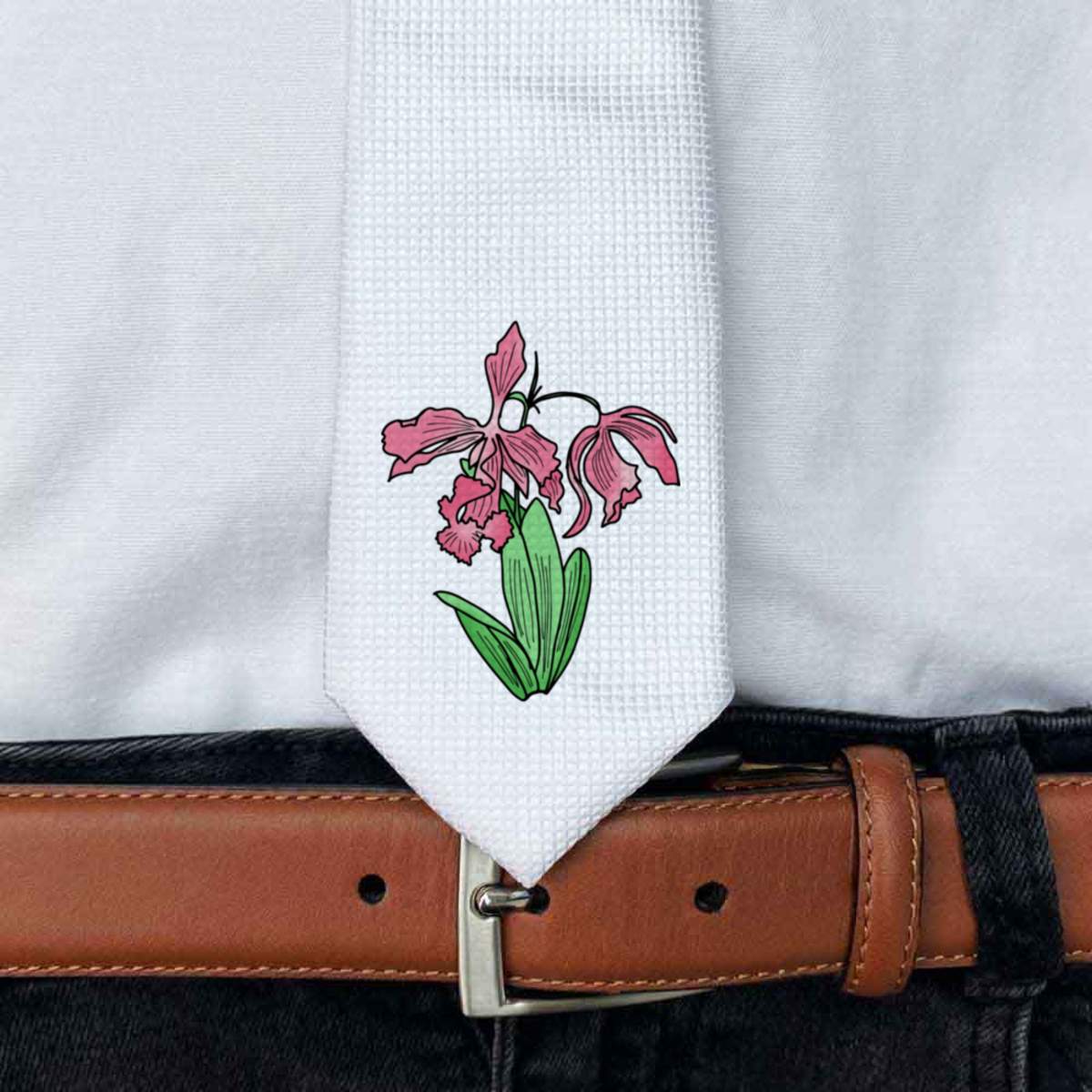 This stylish slim white tie is guaranteed to add class to any outfit. Printed on the front with a design from one of our talented designers, these ties are perfect for formal events, special occasions or making a statement at the office.