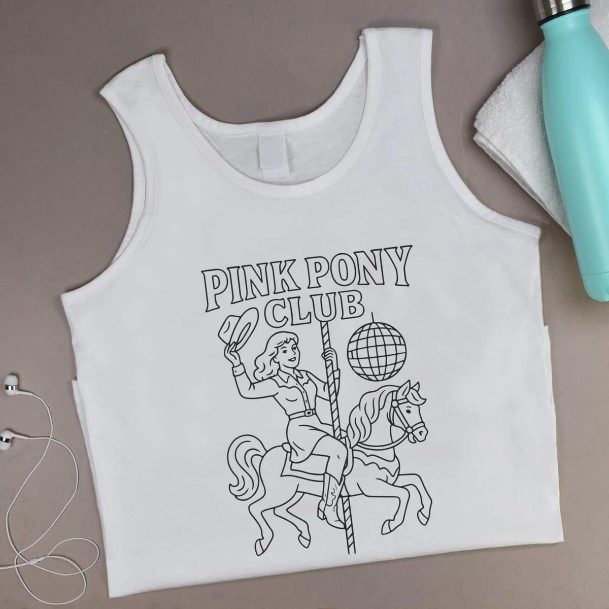 'A cowgirl riding a carousel horse with the words 'pink pony club' overhead.'